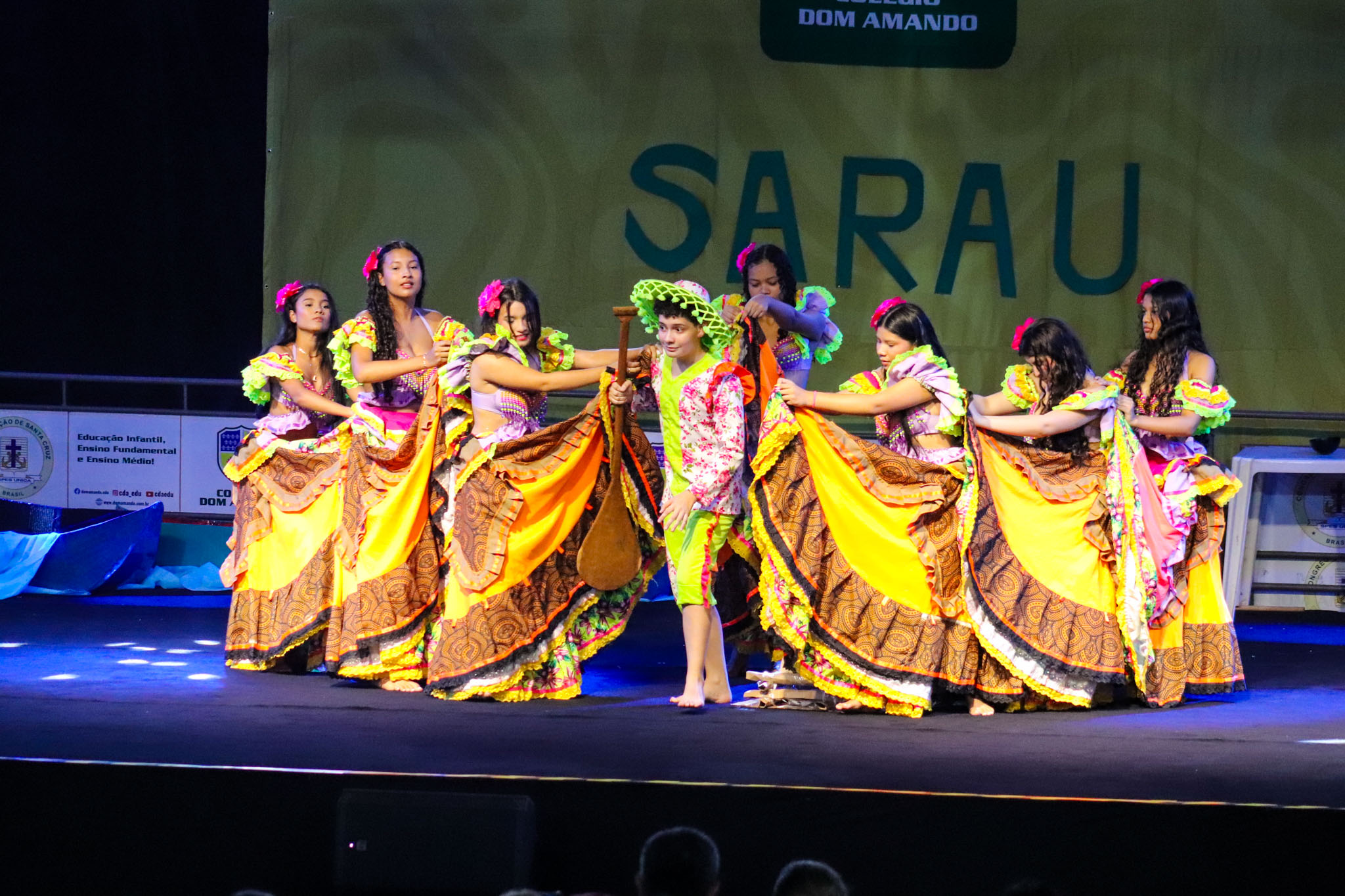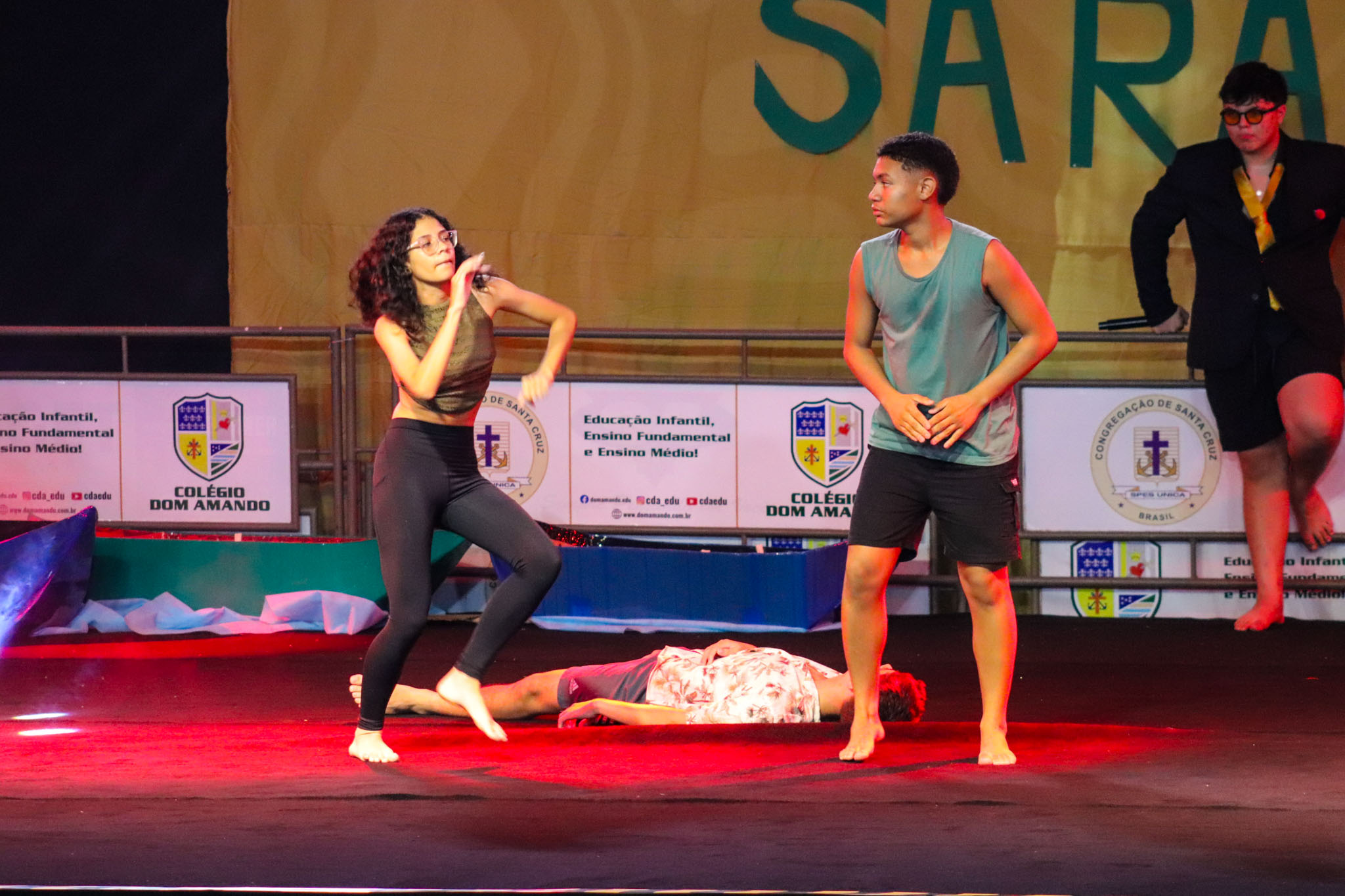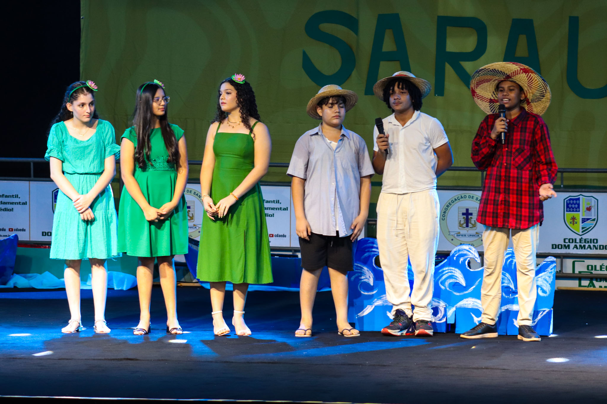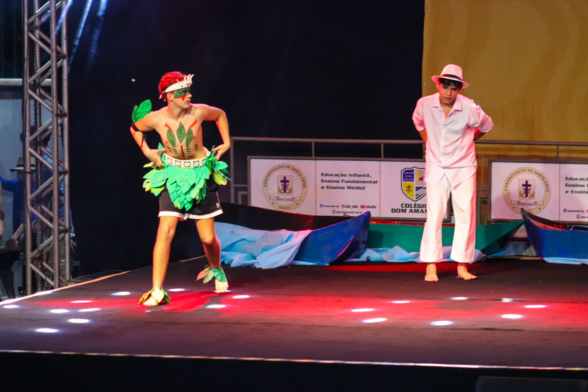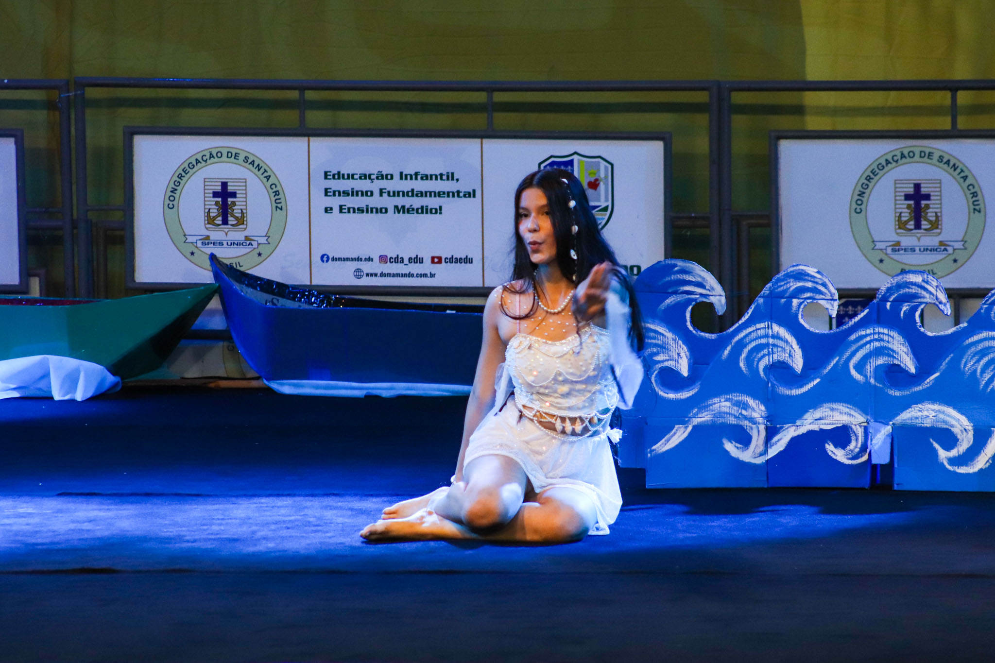 Neste ano, os alunos apresentaram uma adaptação do teatro “Olho de Boto”, de Felisbelo Jaguar Sussuarana, obra regional que destaca elementos da identidade amazônica e que ganhou nova vida no palco através da interpretação dos estudantes. A apresentação reuniu recursos como declamação, narrativa, música e encenação, permitindo que os participantes explorassem diferentes linguagens artísticas.