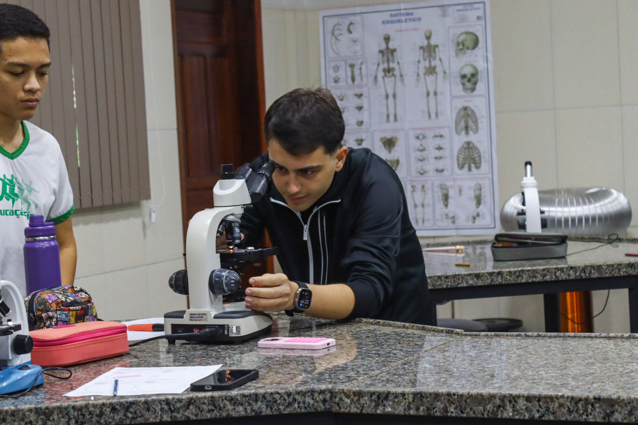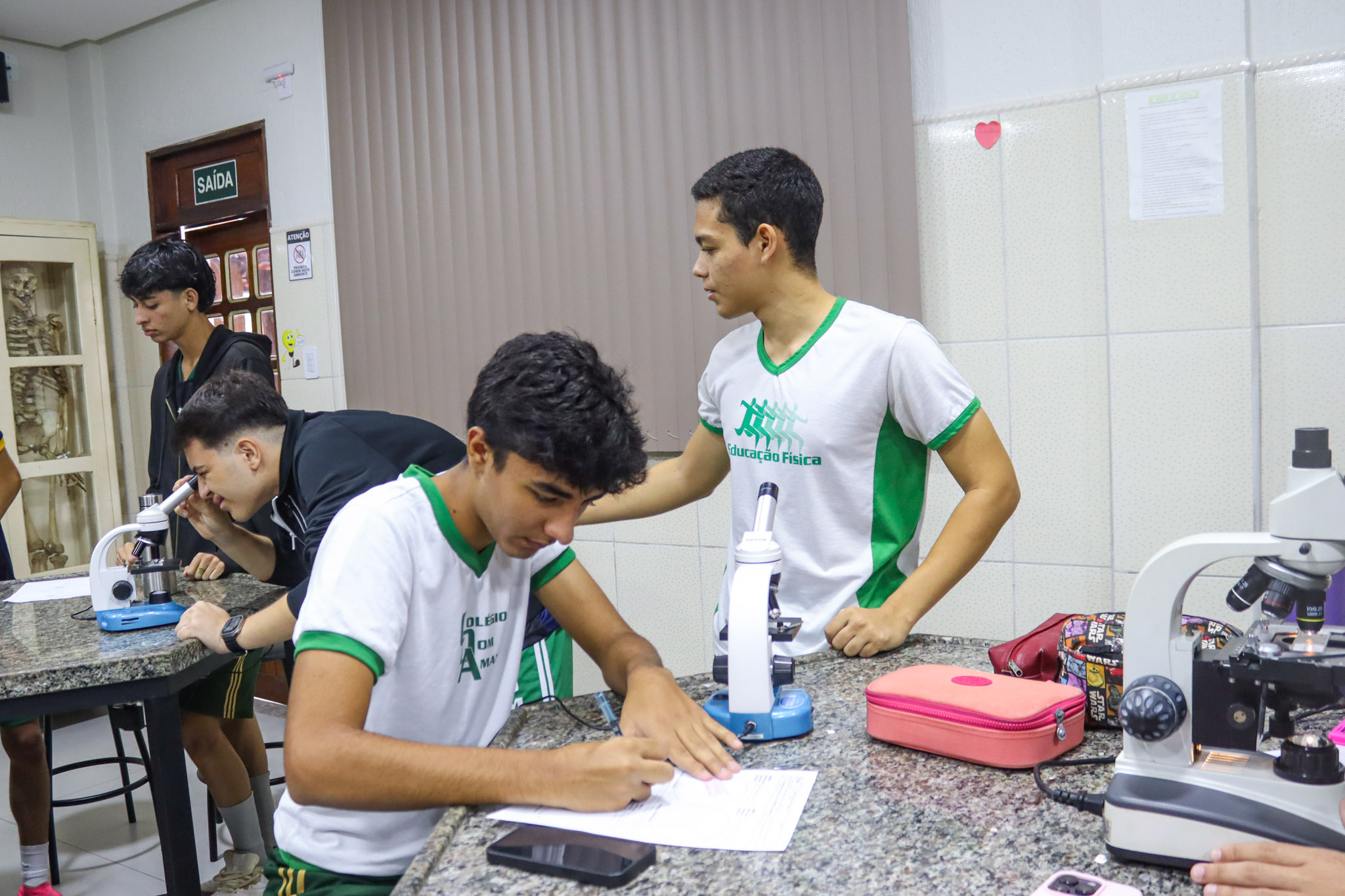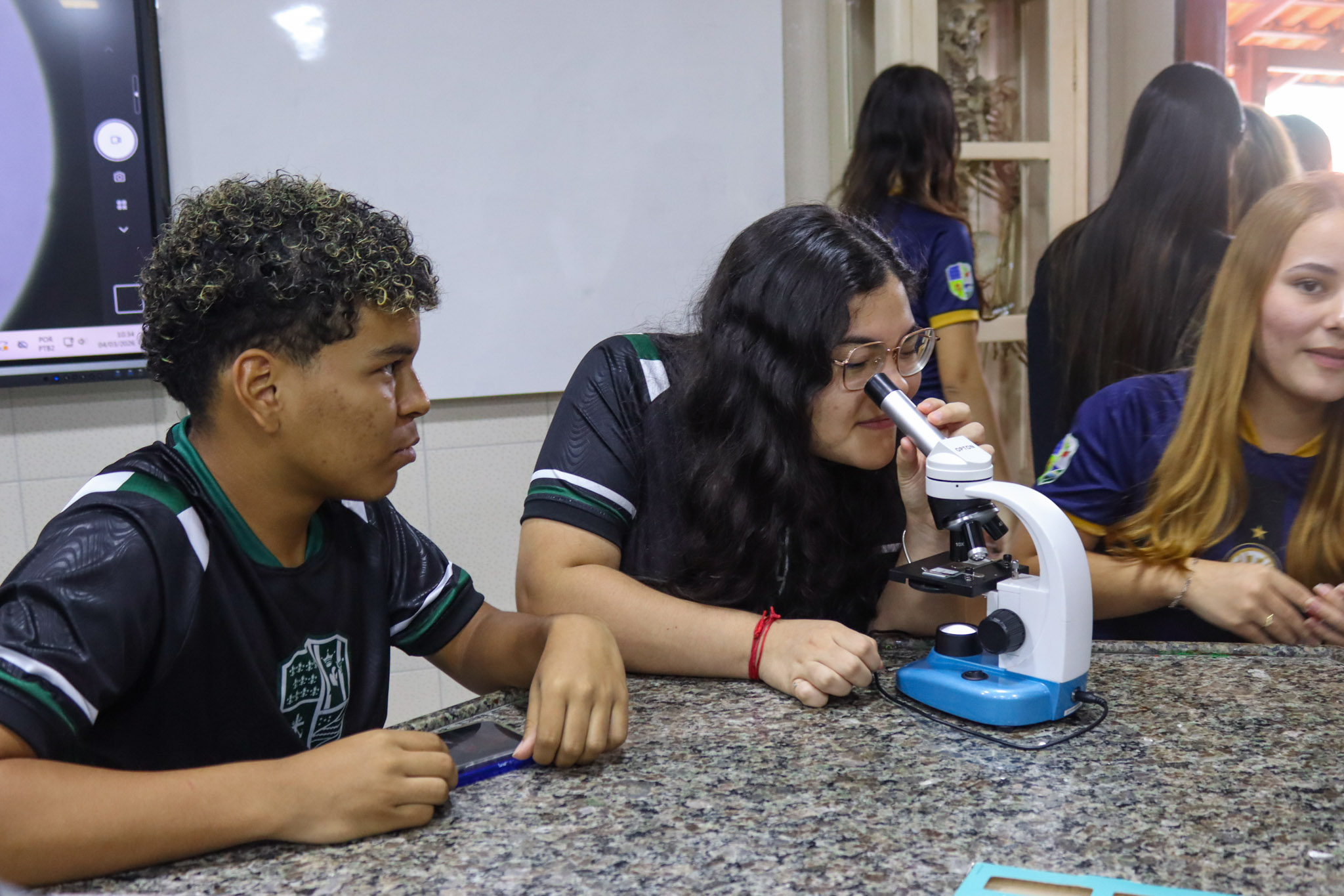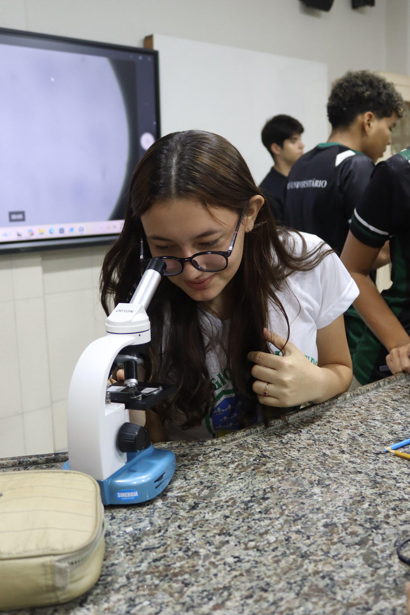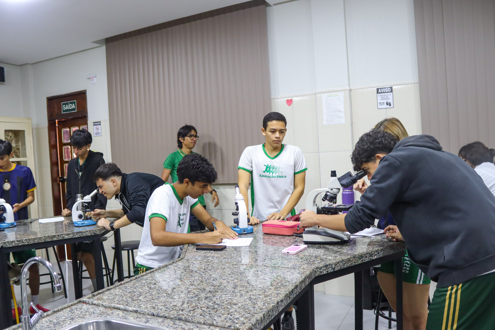 Durante a aula, os alunos aprenderam sobre o funcionamento e a estrutura do microscópio óptico, além de técnicas básicas de preparação e observação de lâminas. Com o auxílio do equipamento, puderam realizar a observação de células e tecidos, identificando estruturas microscópicas e relacionando-as aos conteúdos estudados em sala.