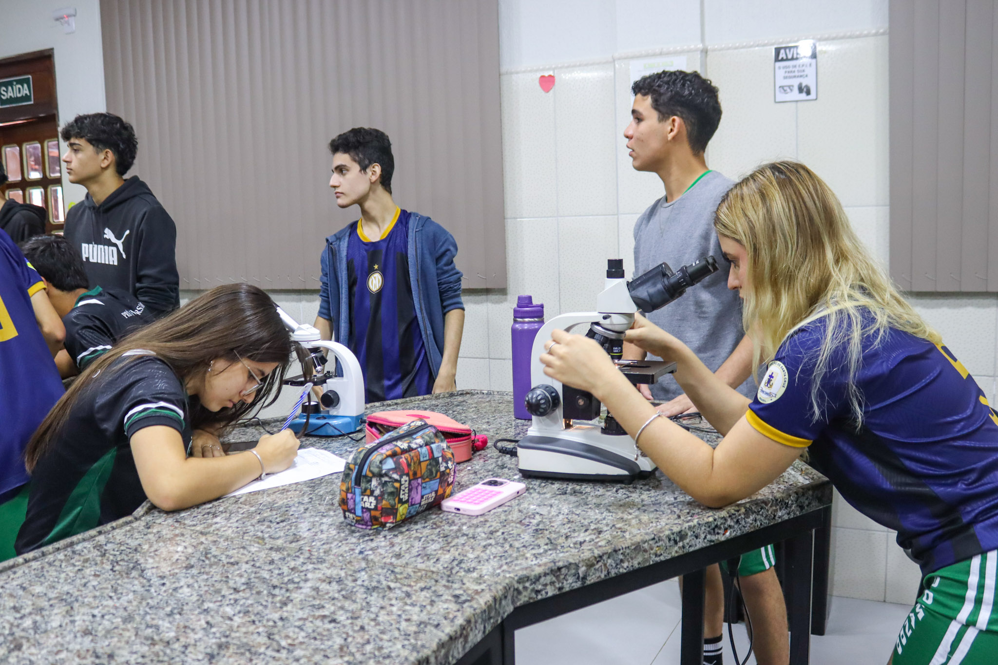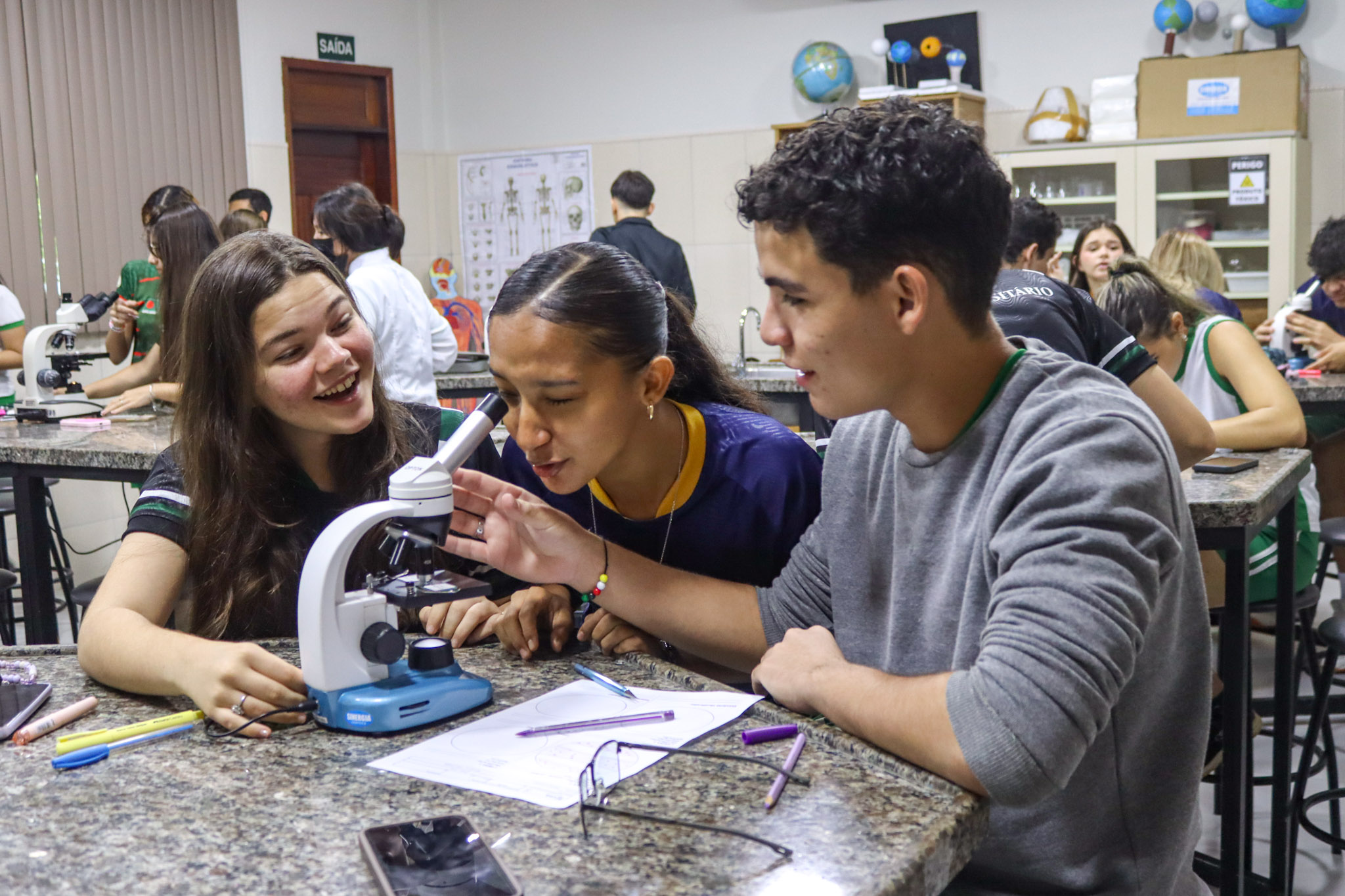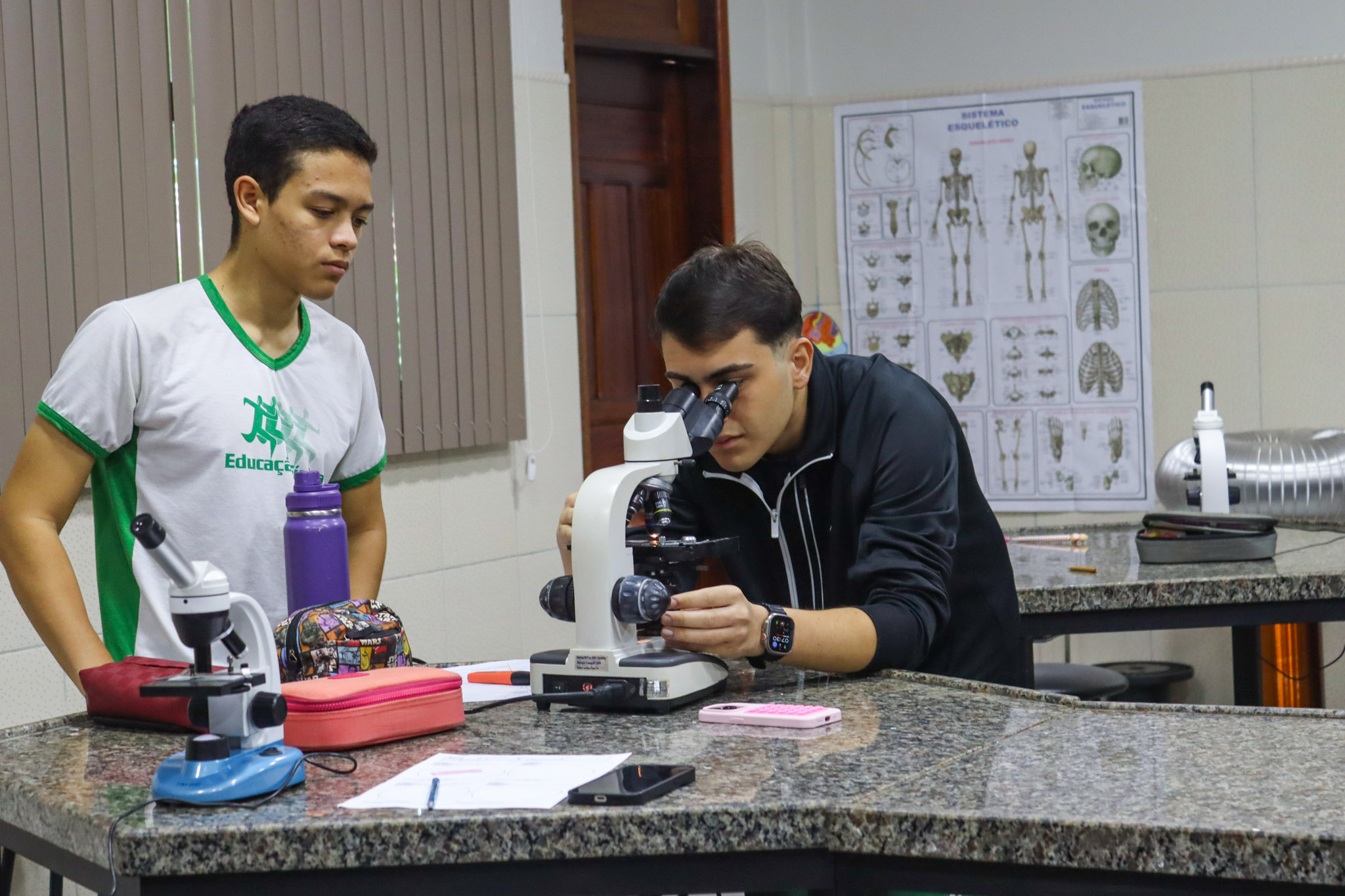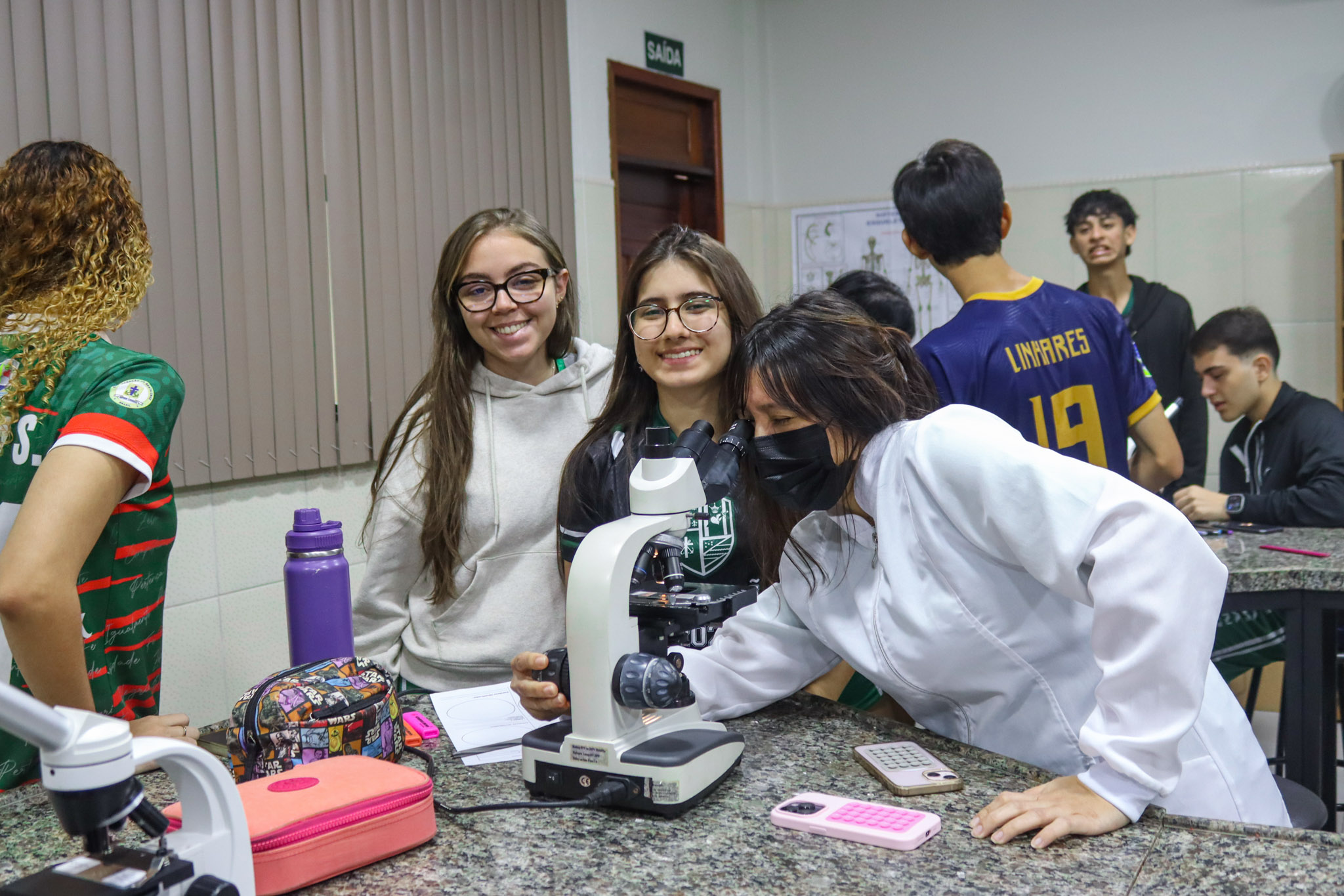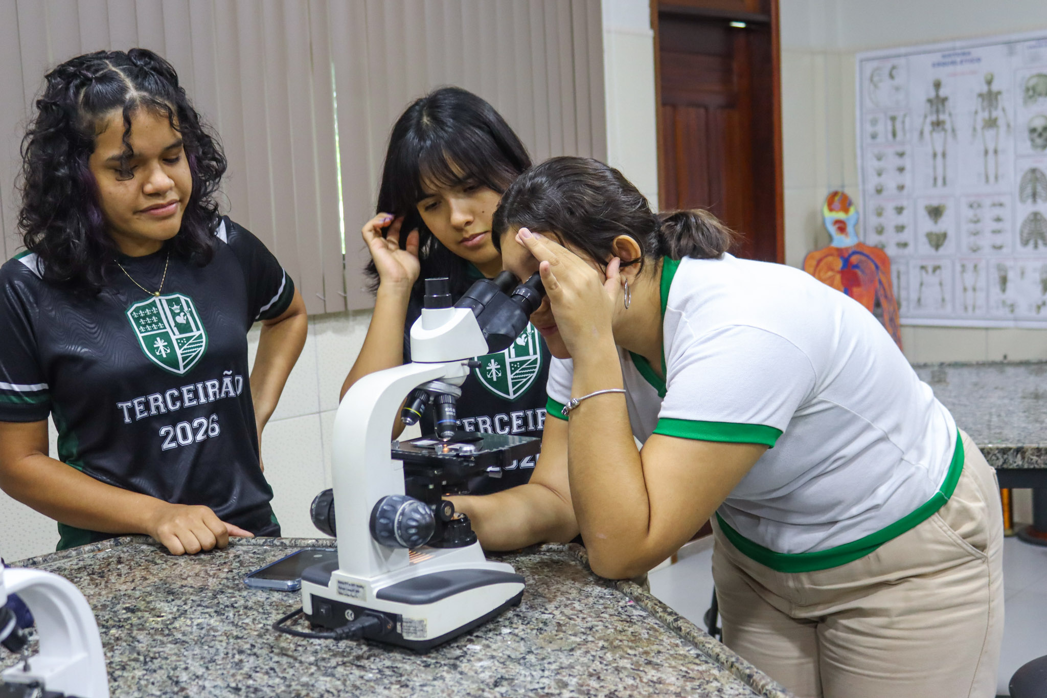 Durante a aula, os alunos aprenderam sobre o funcionamento e a estrutura do microscópio óptico, além de técnicas básicas de preparação e observação de lâminas. Com o auxílio do equipamento, puderam realizar a observação de células e tecidos, identificando estruturas microscópicas e relacionando-as aos conteúdos estudados em sala.