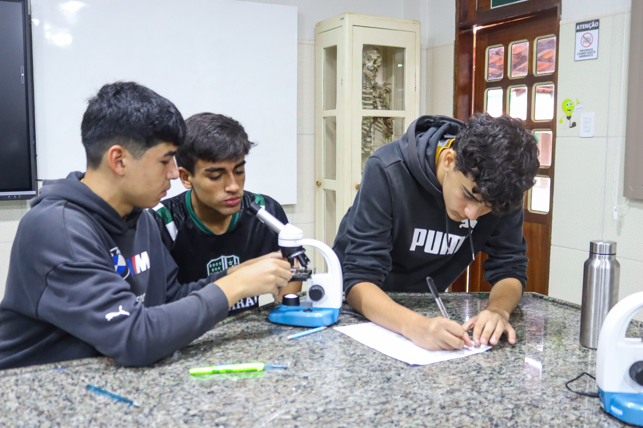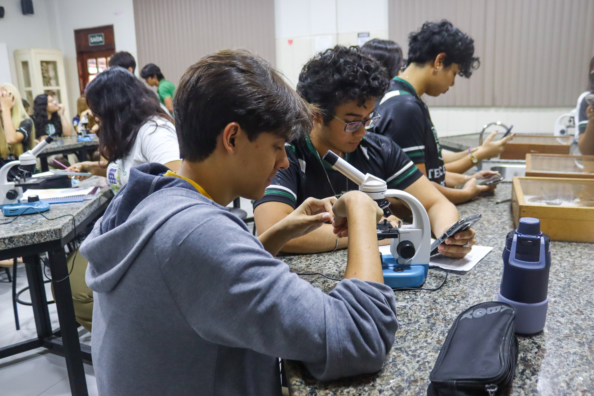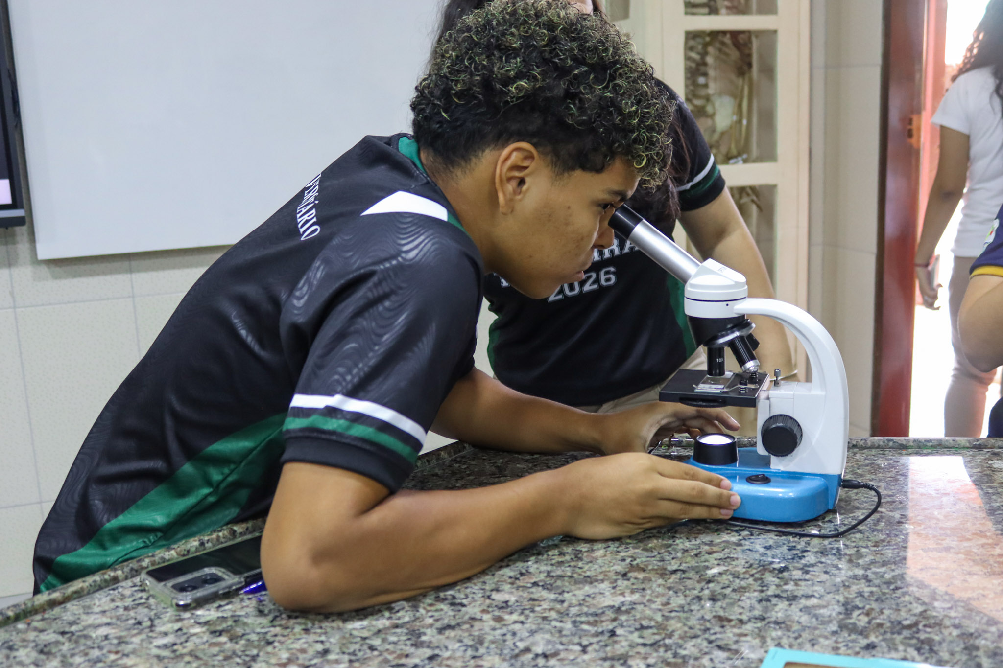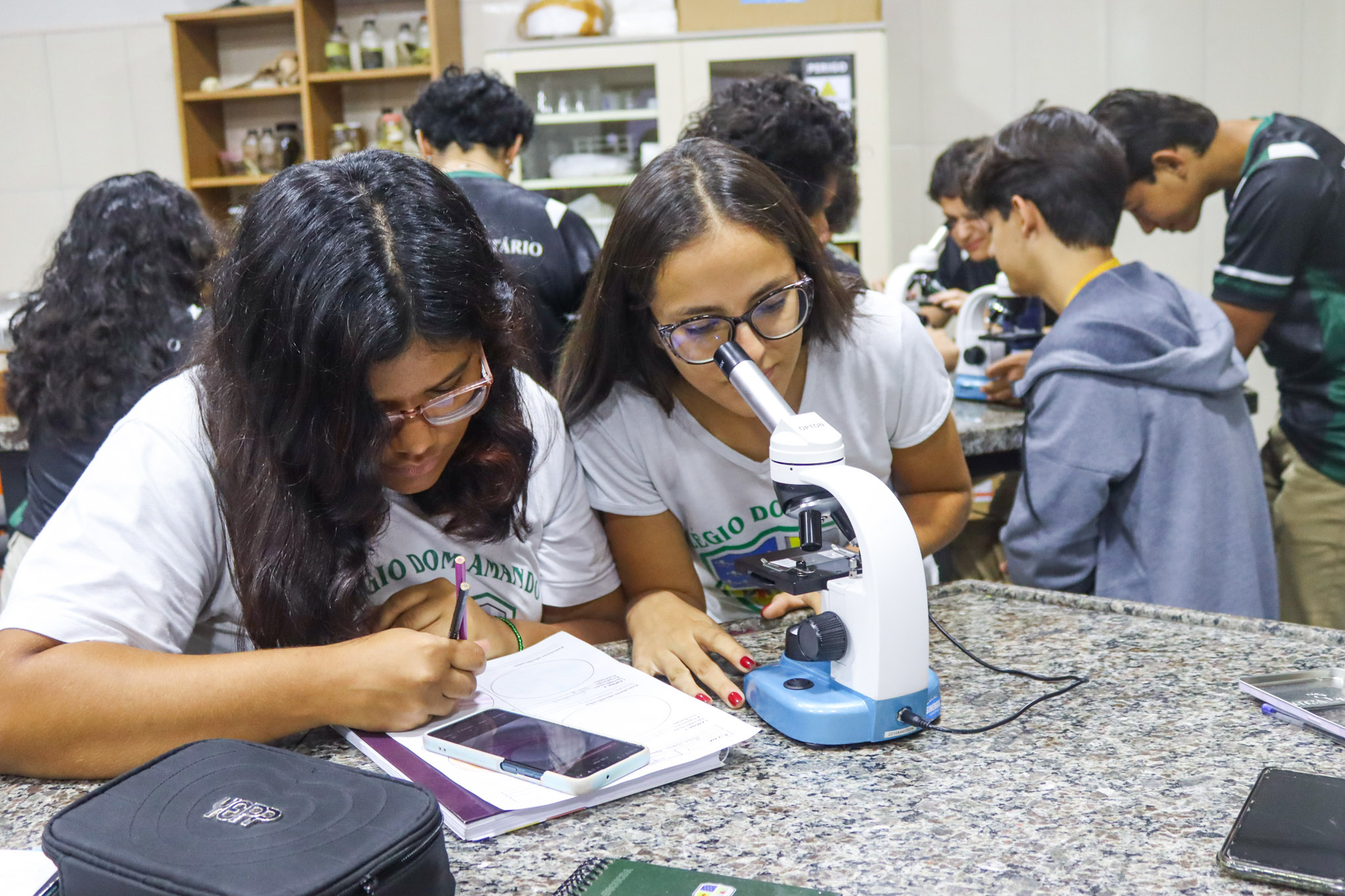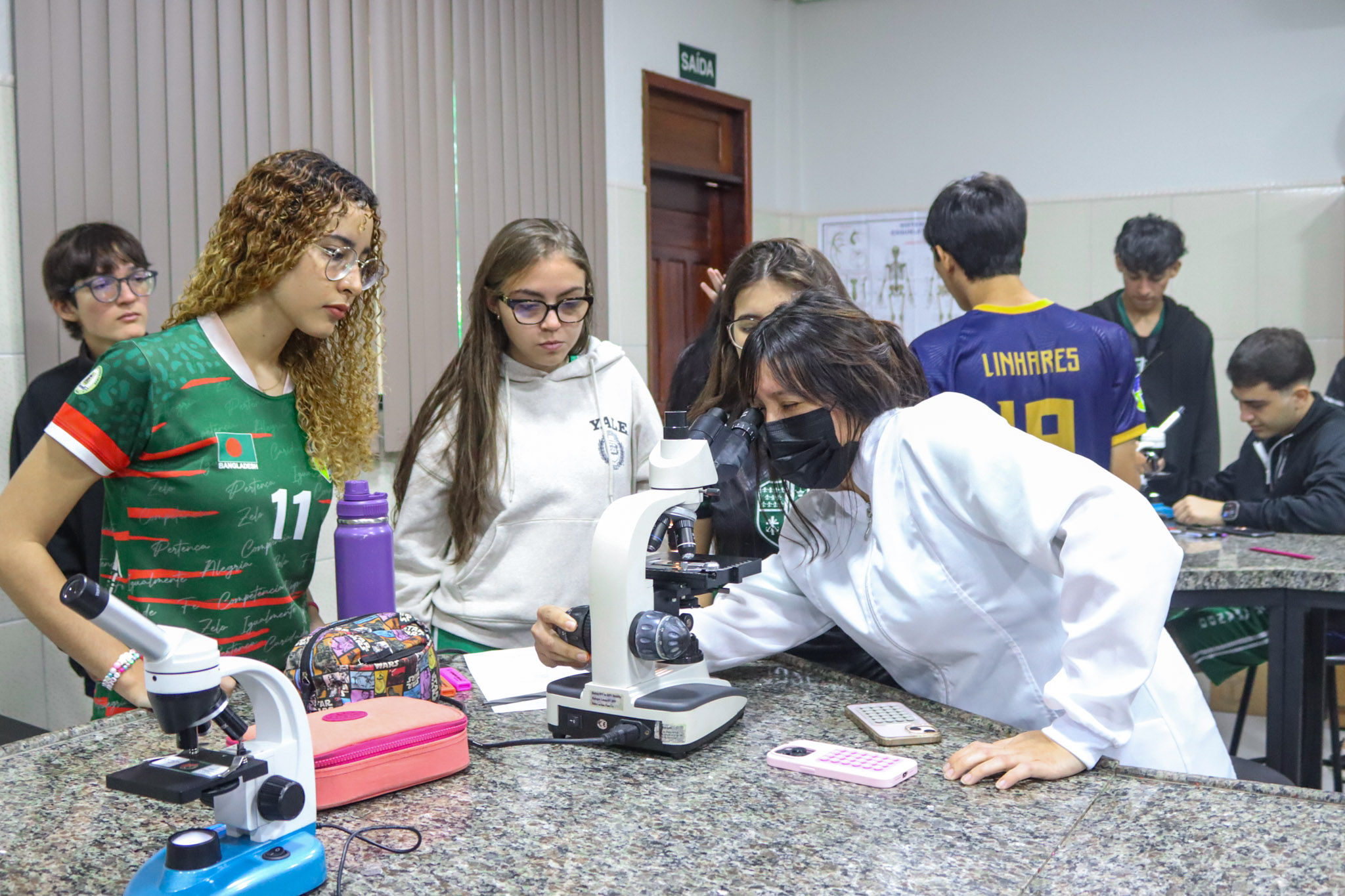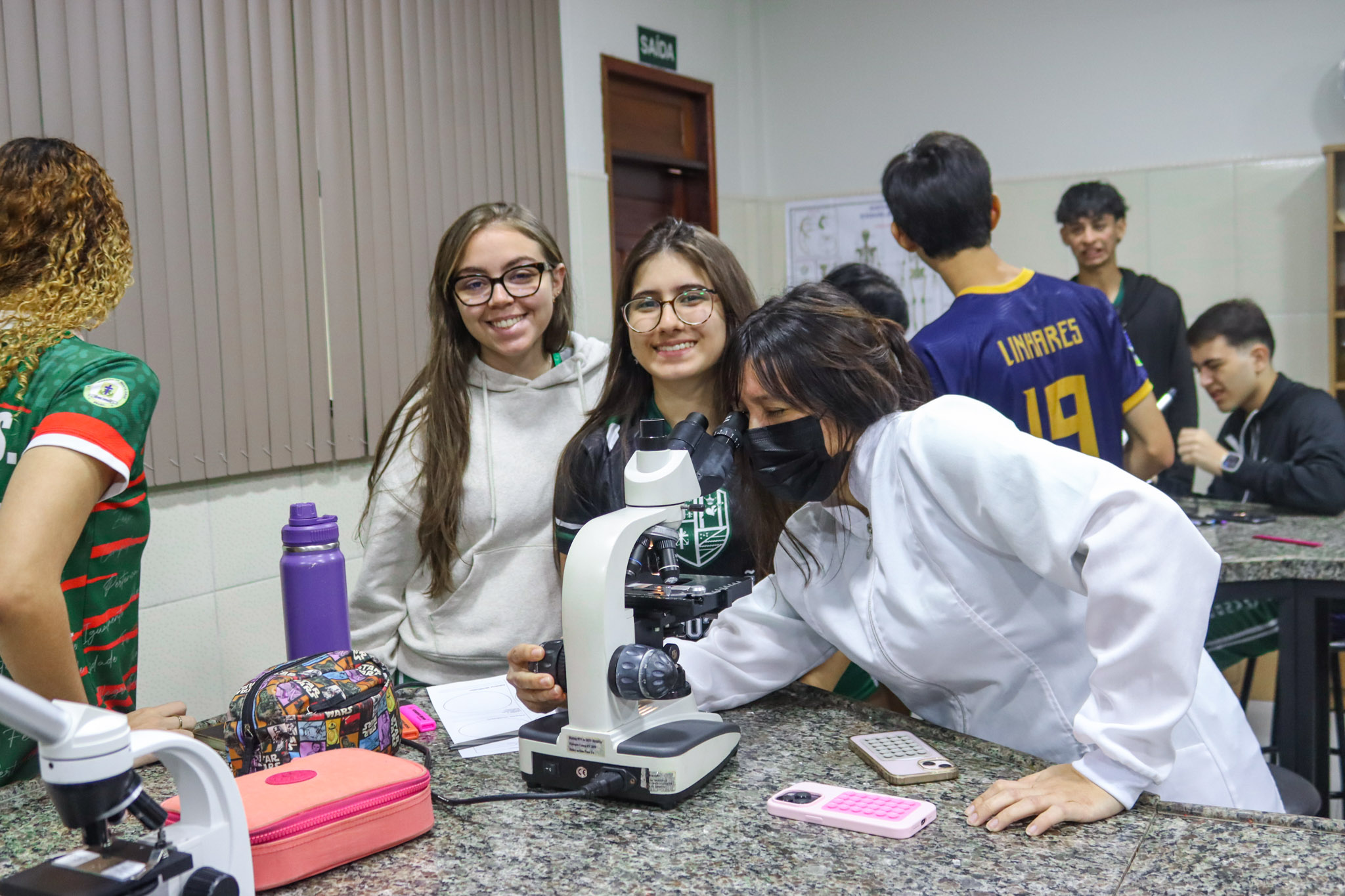 Durante a aula, os alunos aprenderam sobre o funcionamento e a estrutura do microscópio óptico, além de técnicas básicas de preparação e observação de lâminas. Com o auxílio do equipamento, puderam realizar a observação de células e tecidos, identificando estruturas microscópicas e relacionando-as aos conteúdos estudados em sala.