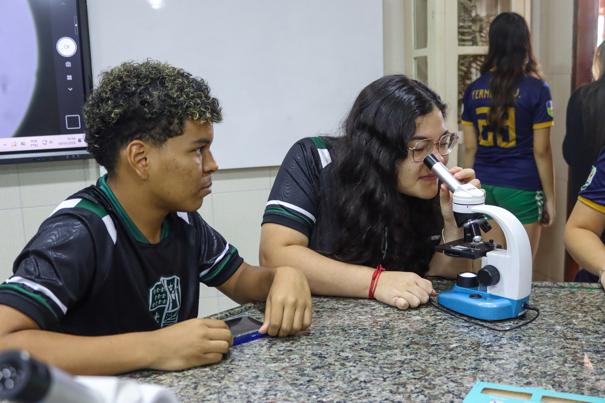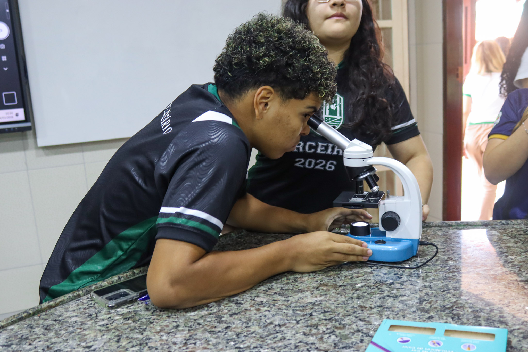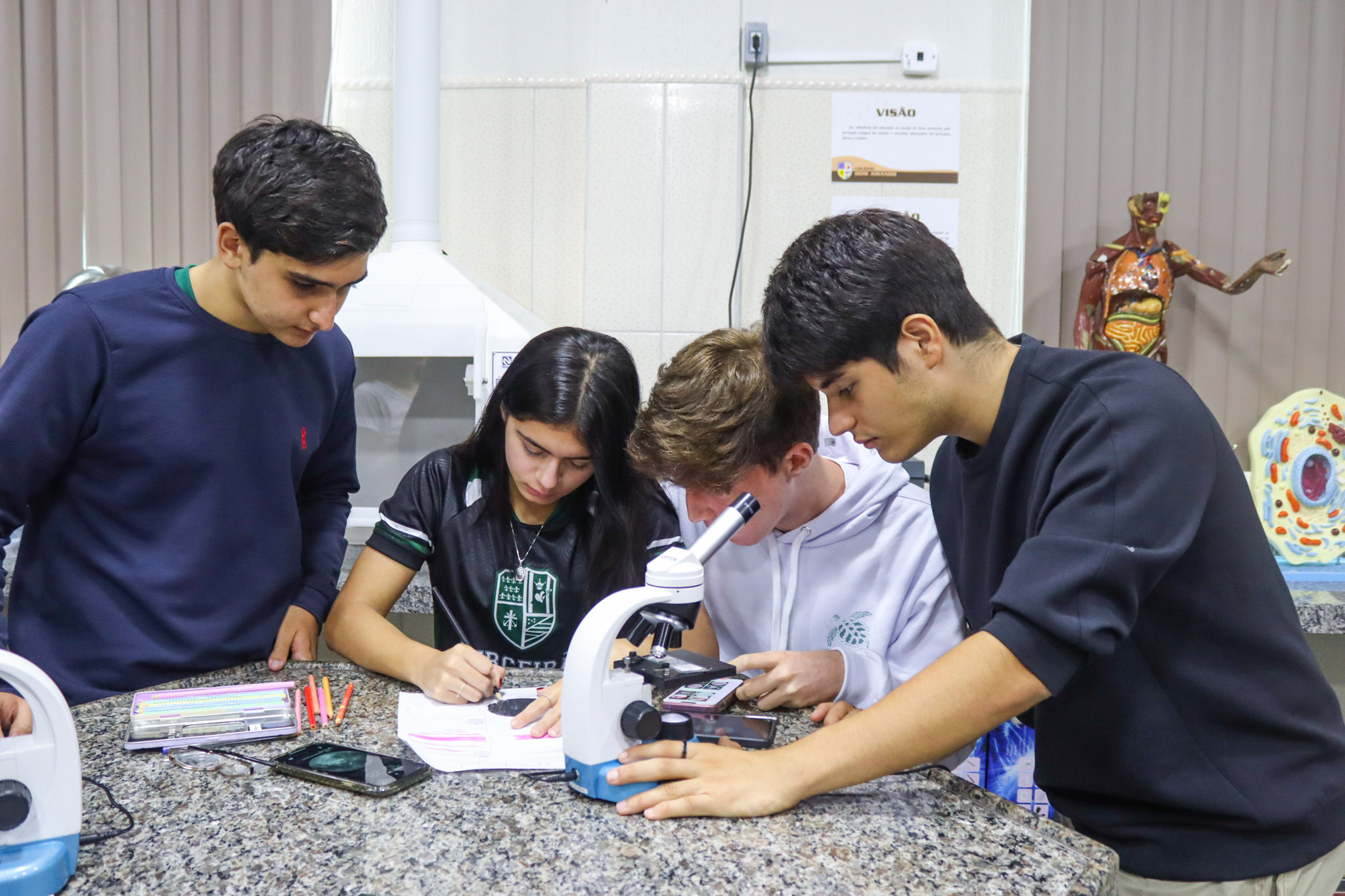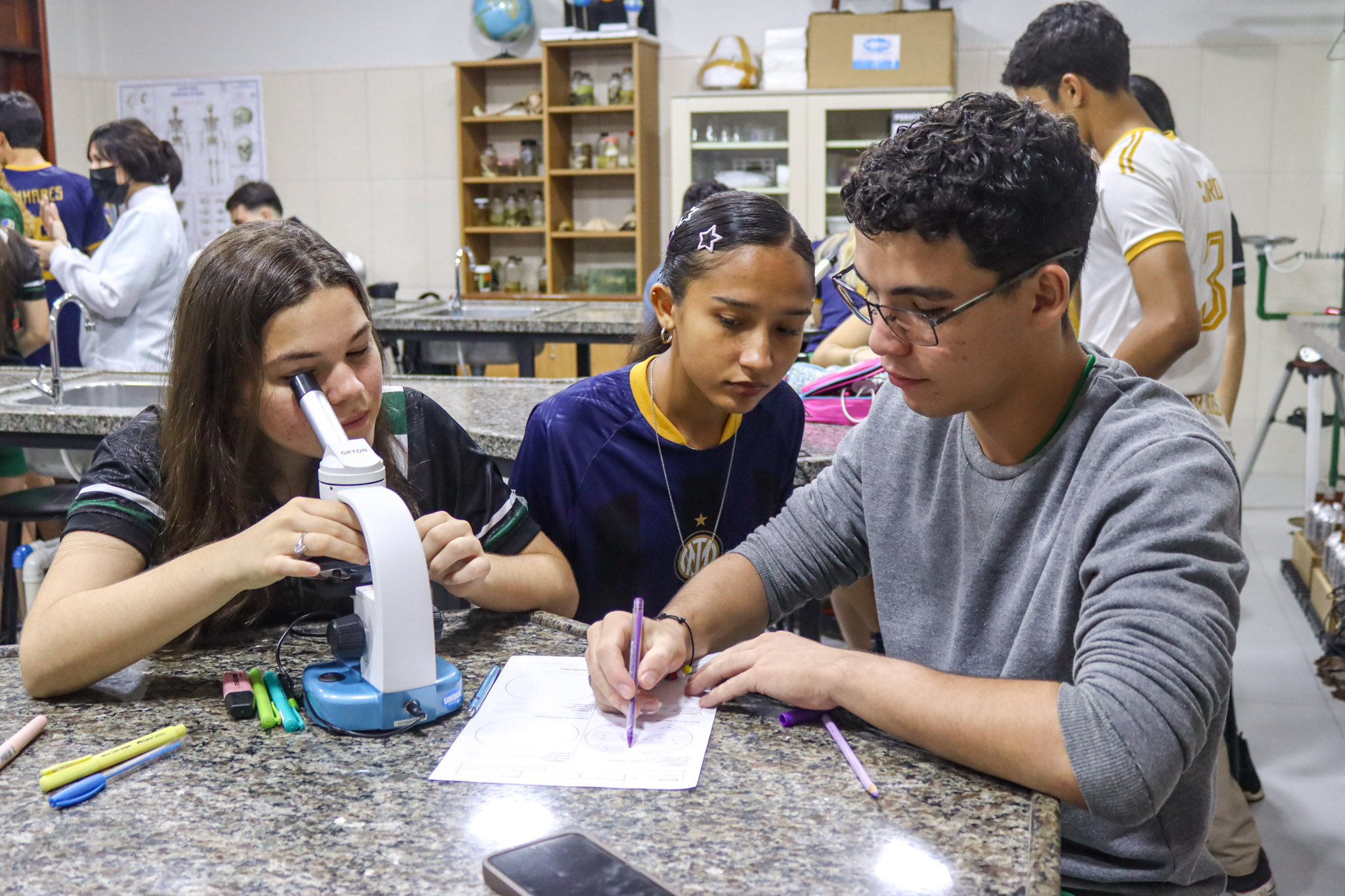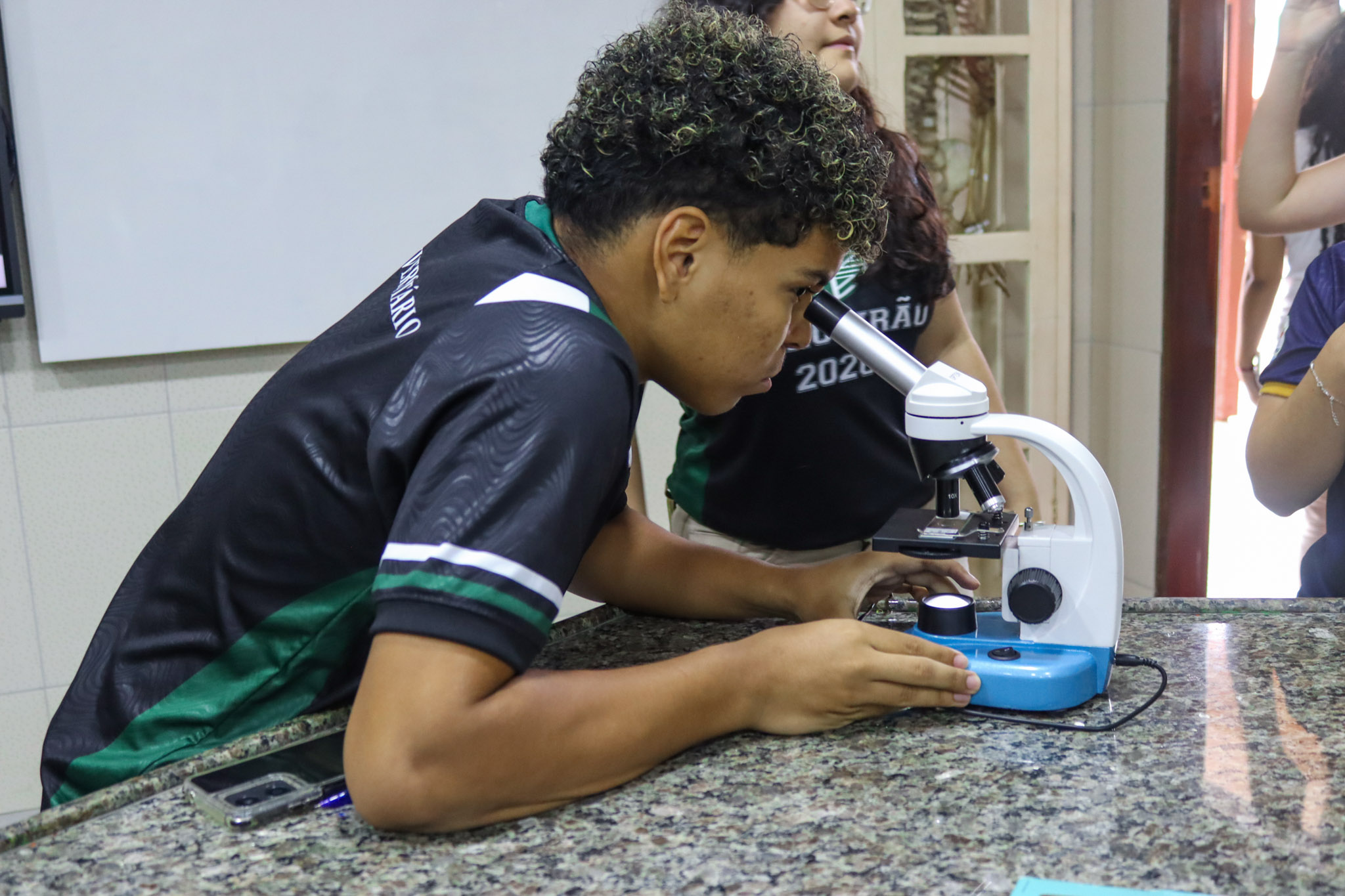 Durante a aula, os alunos aprenderam sobre o funcionamento e a estrutura do microscópio óptico, além de técnicas básicas de preparação e observação de lâminas. Com o auxílio do equipamento, puderam realizar a observação de células e tecidos, identificando estruturas microscópicas e relacionando-as aos conteúdos estudados em sala.