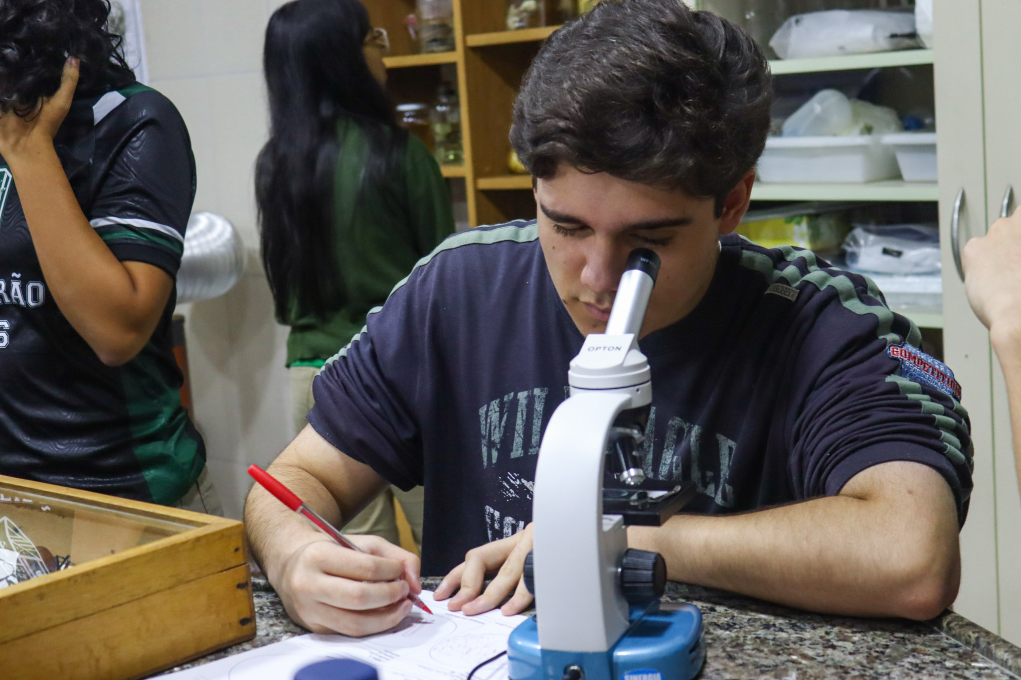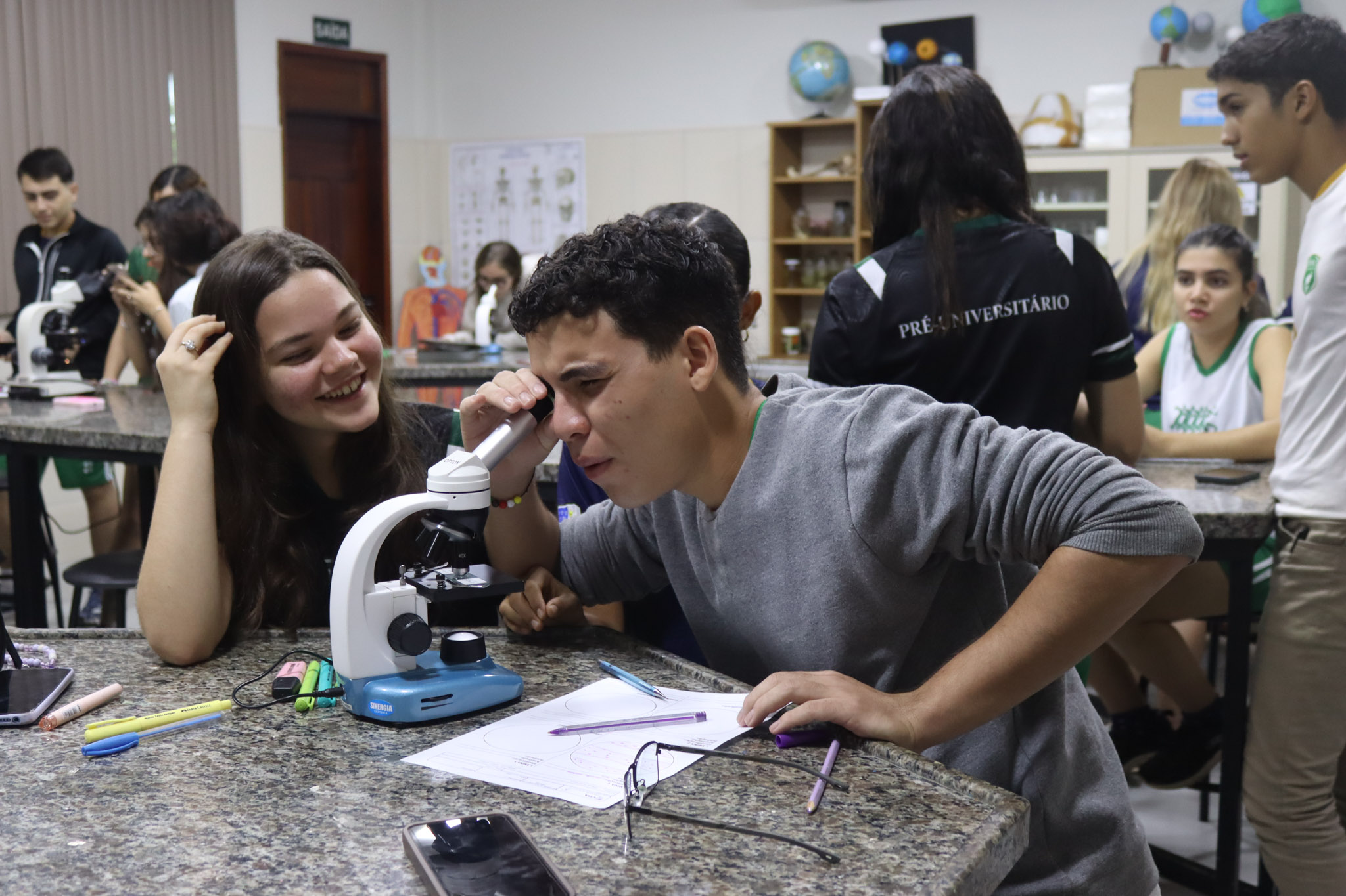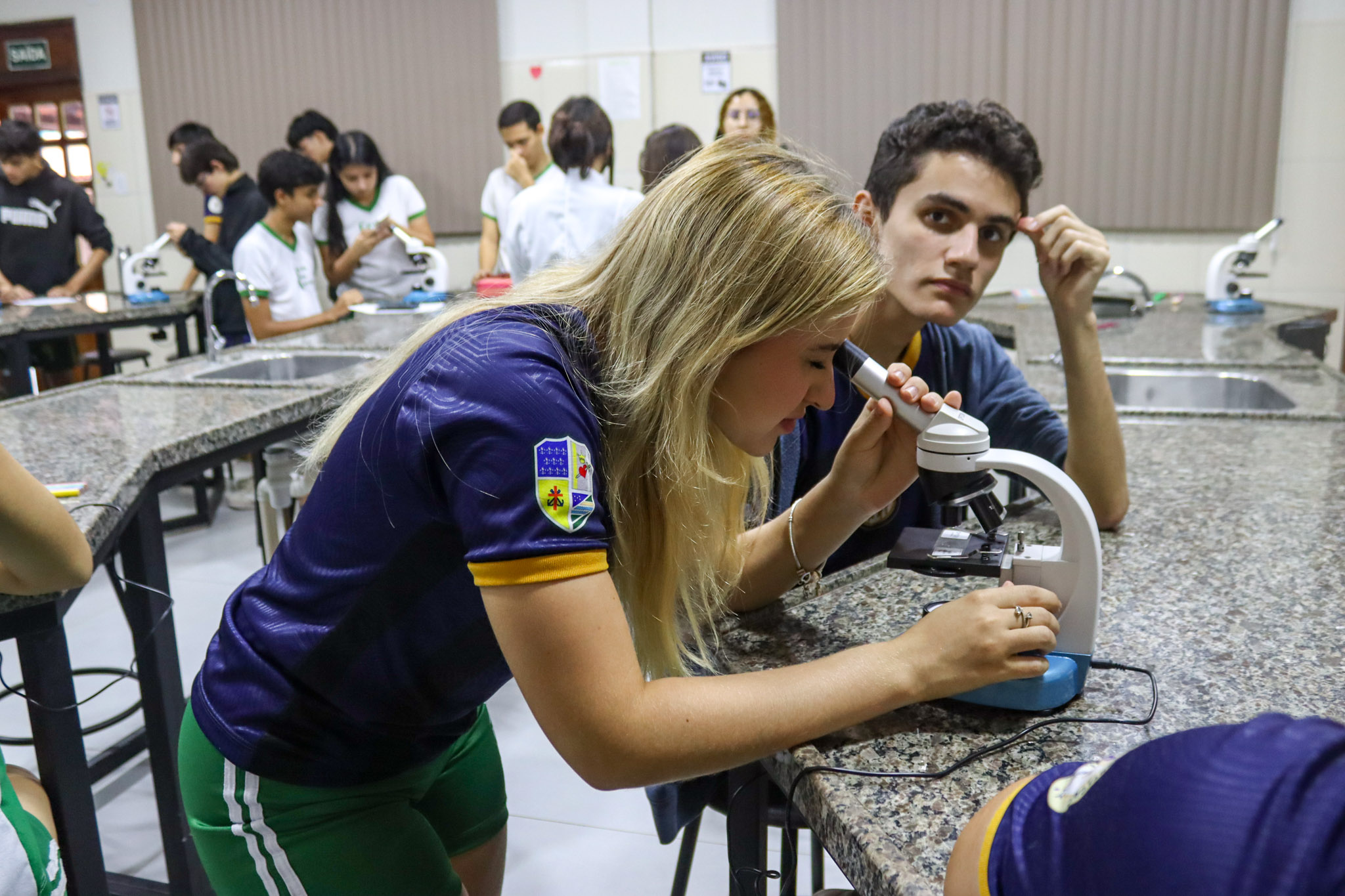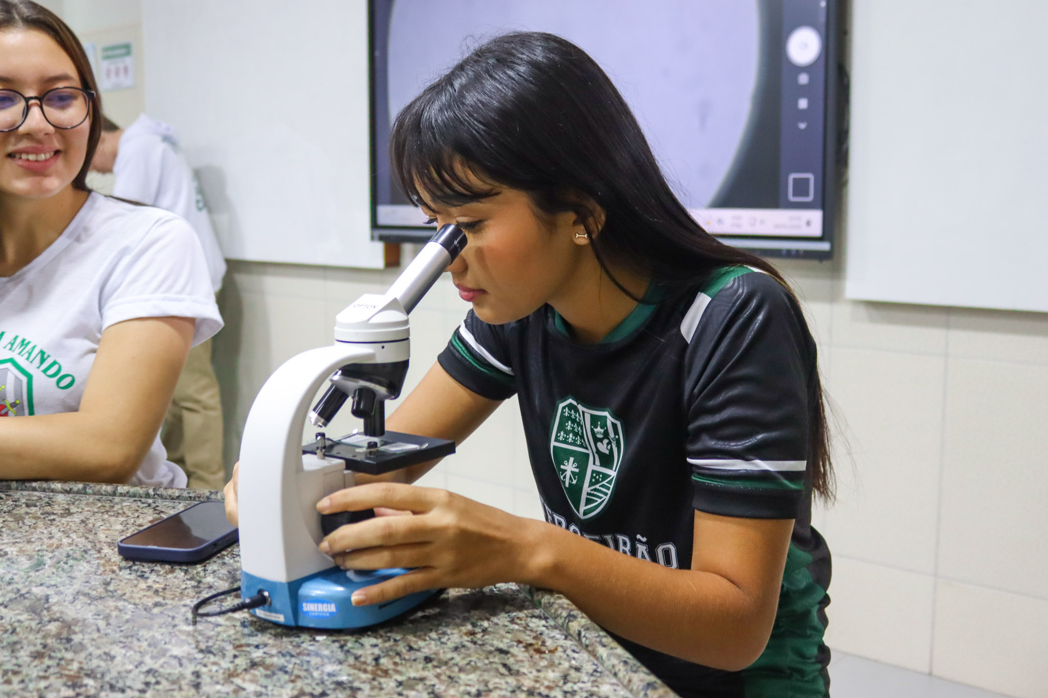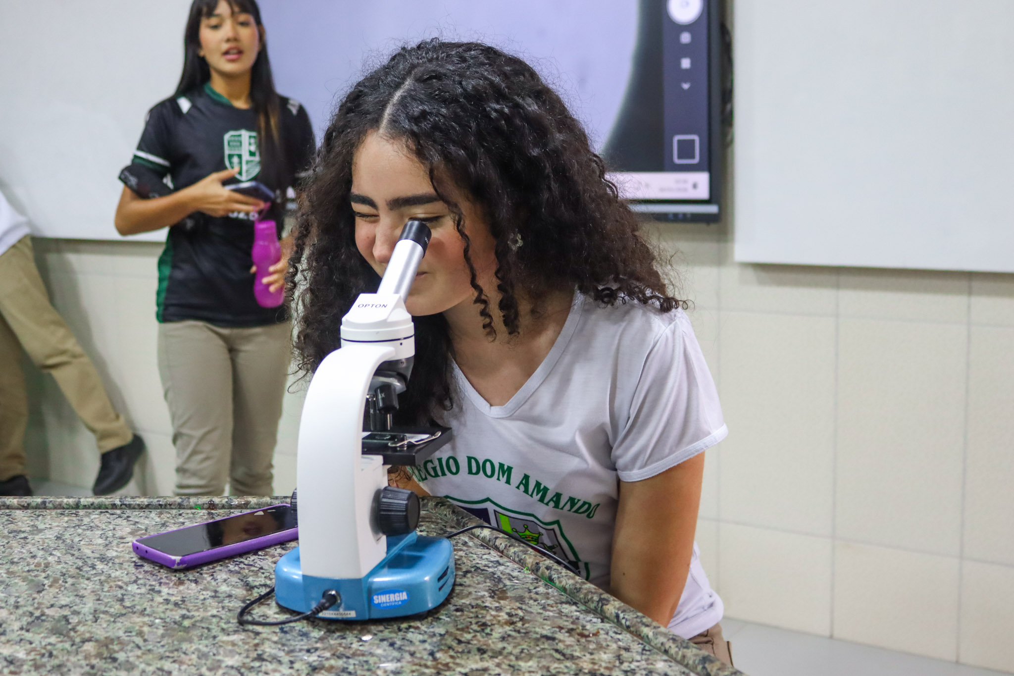 Durante a aula, os alunos aprenderam sobre o funcionamento e a estrutura do microscópio óptico, além de técnicas básicas de preparação e observação de lâminas. Com o auxílio do equipamento, puderam realizar a observação de células e tecidos, identificando estruturas microscópicas e relacionando-as aos conteúdos estudados em sala.