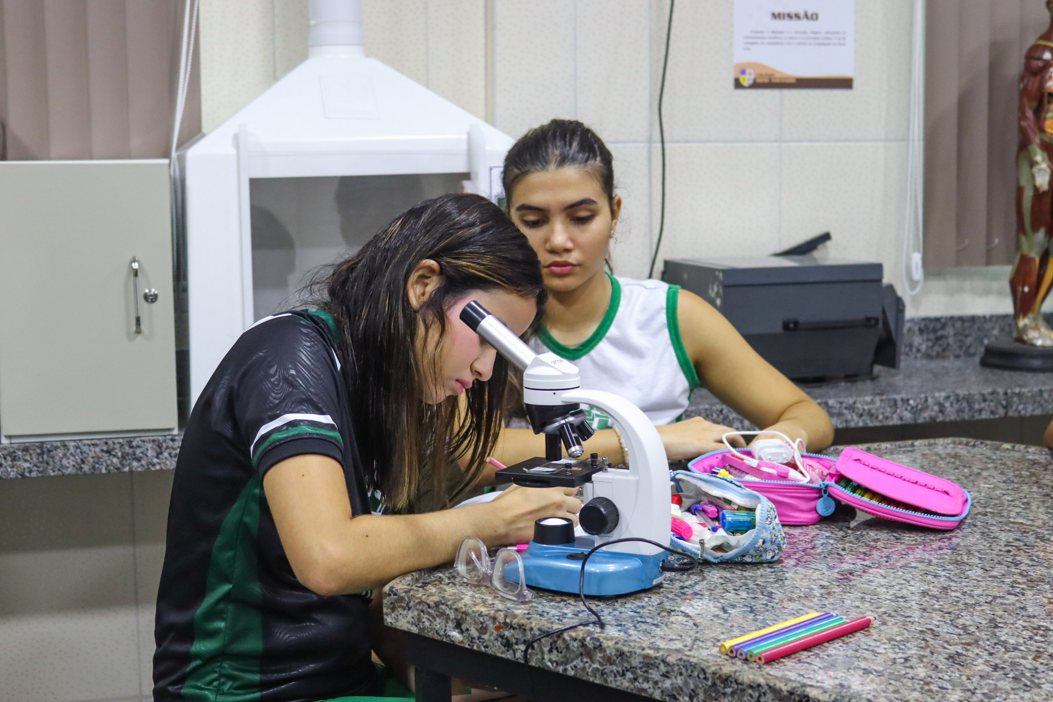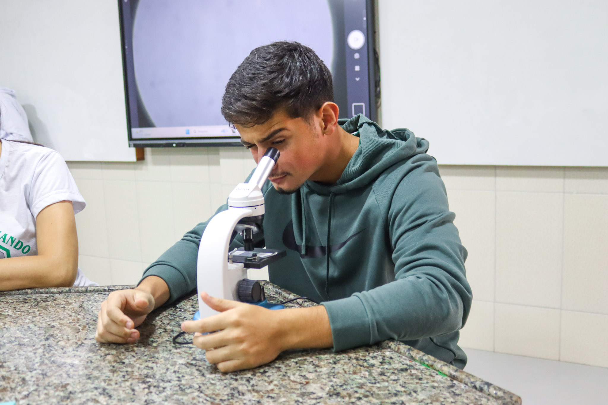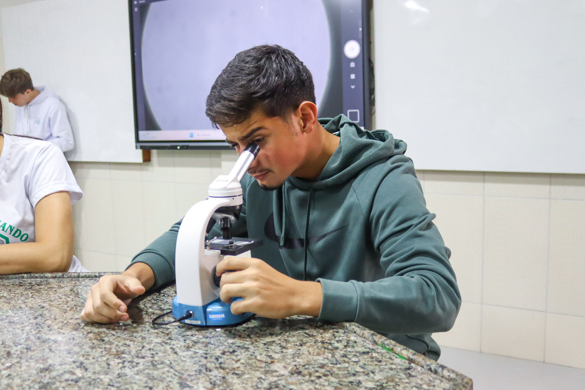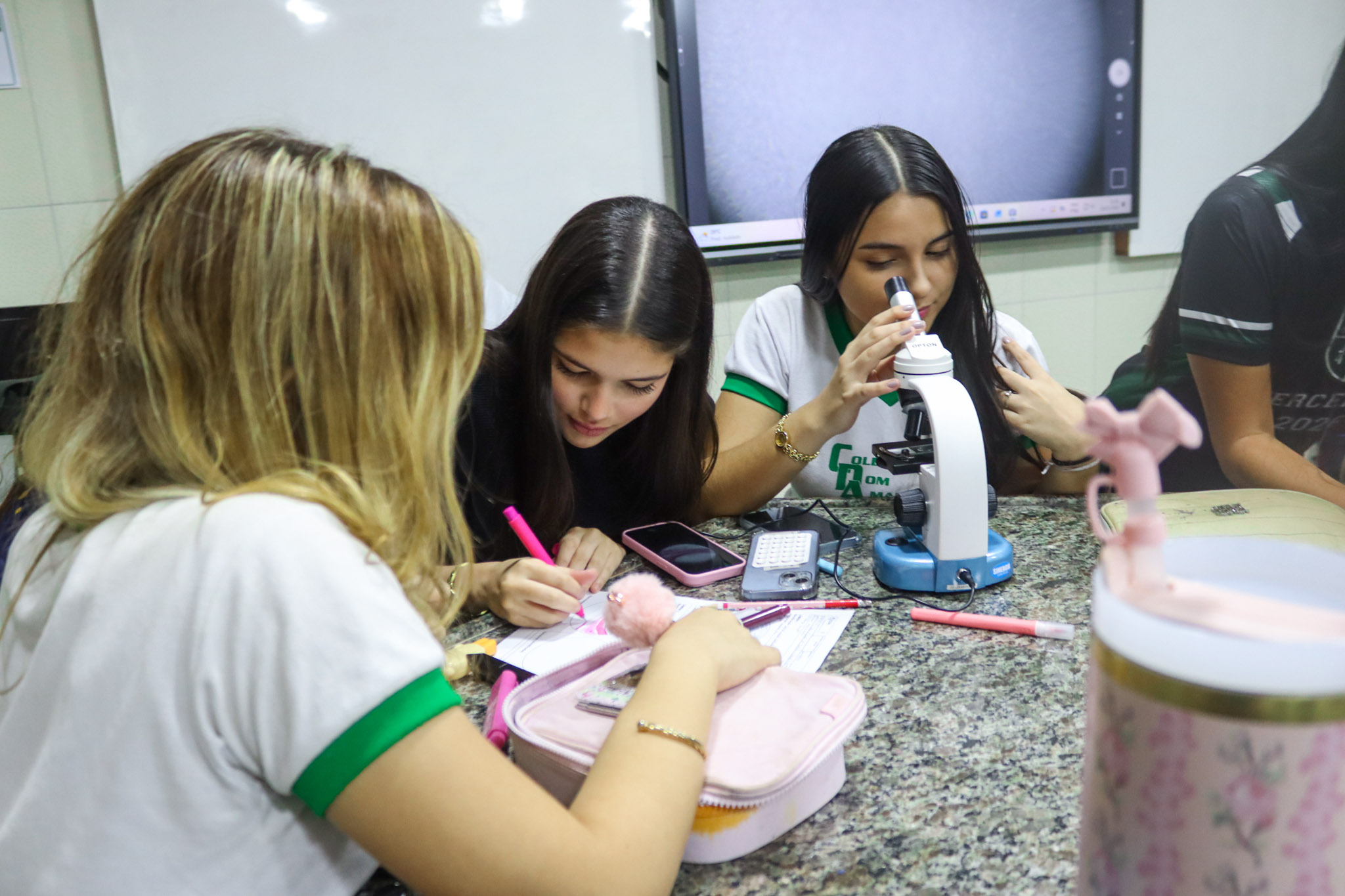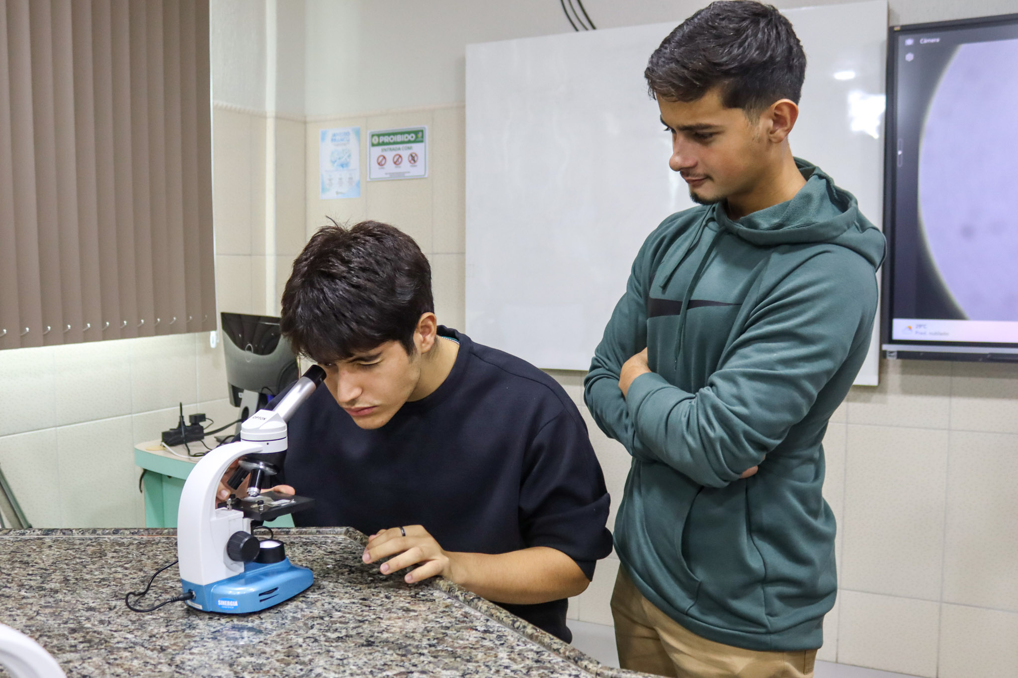 Durante a aula, os alunos aprenderam sobre o funcionamento e a estrutura do microscópio óptico, além de técnicas básicas de preparação e observação de lâminas. Com o auxílio do equipamento, puderam realizar a observação de células e tecidos, identificando estruturas microscópicas e relacionando-as aos conteúdos estudados em sala.