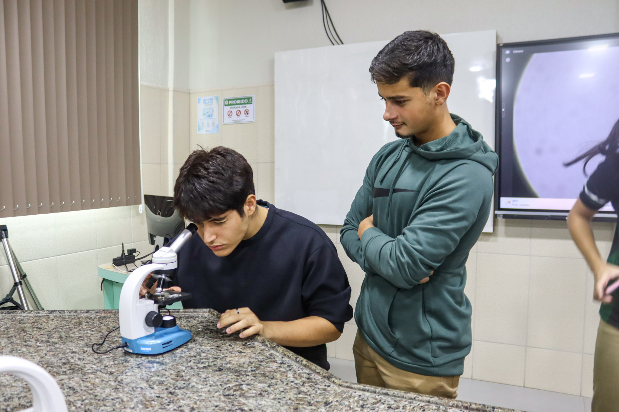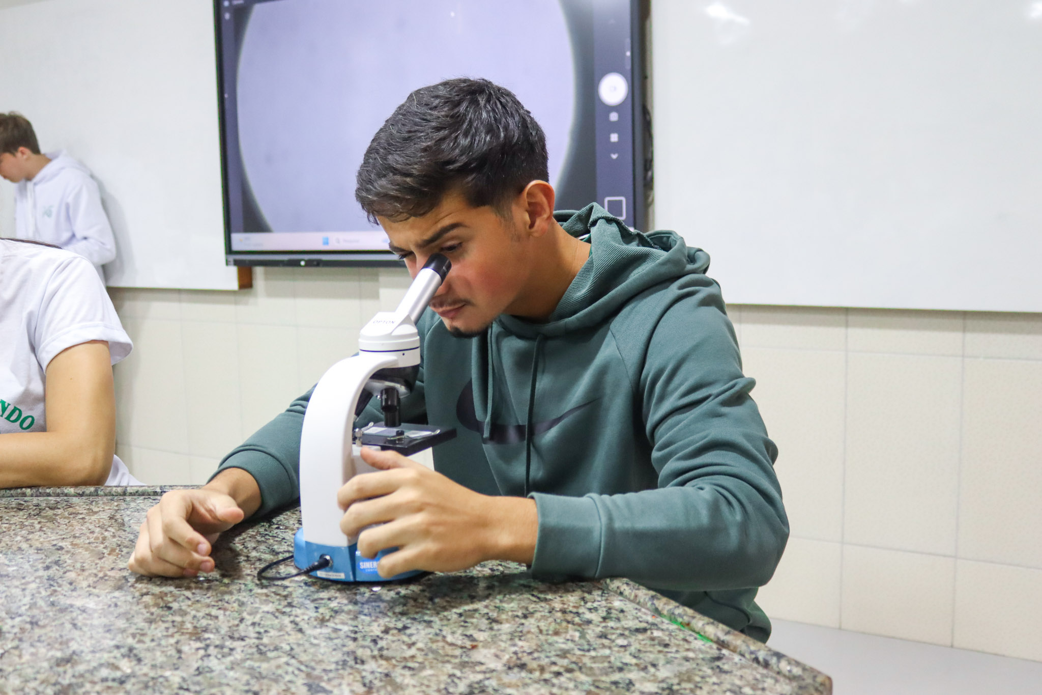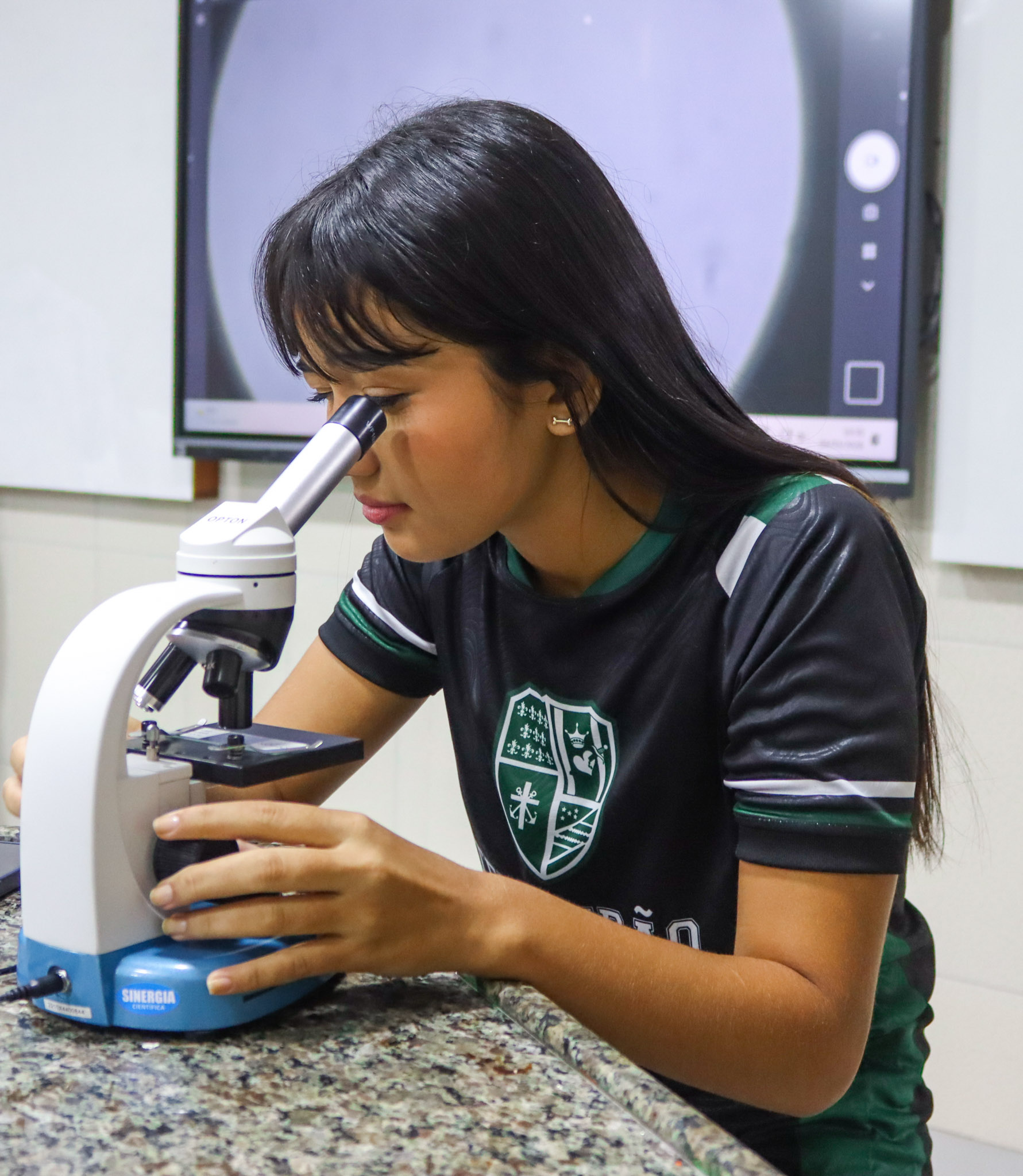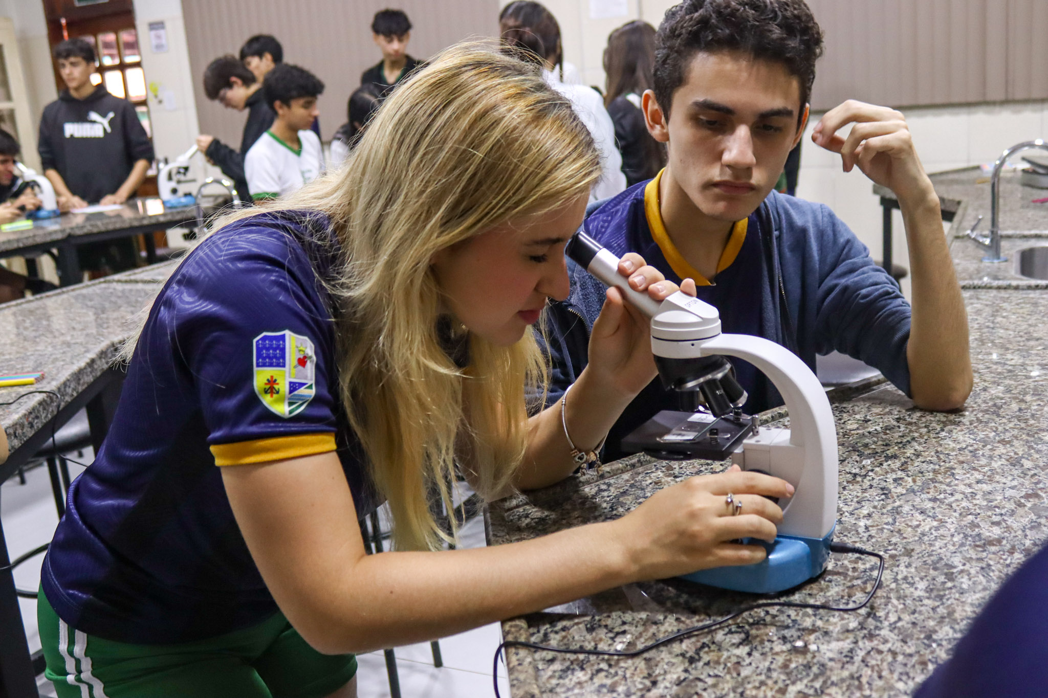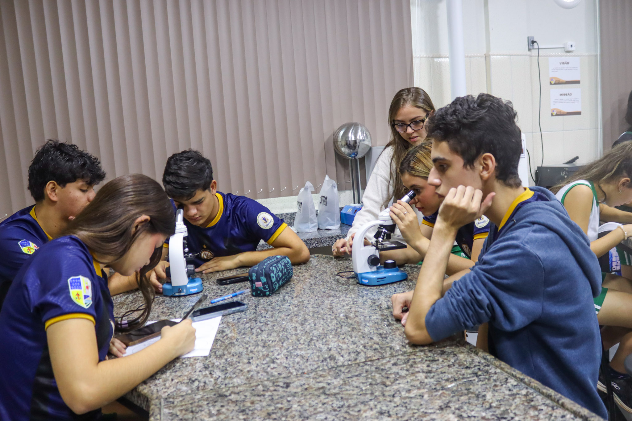 Durante a aula, os alunos aprenderam sobre o funcionamento e a estrutura do microscópio óptico, além de técnicas básicas de preparação e observação de lâminas. Com o auxílio do equipamento, puderam realizar a observação de células e tecidos, identificando estruturas microscópicas e relacionando-as aos conteúdos estudados em sala.