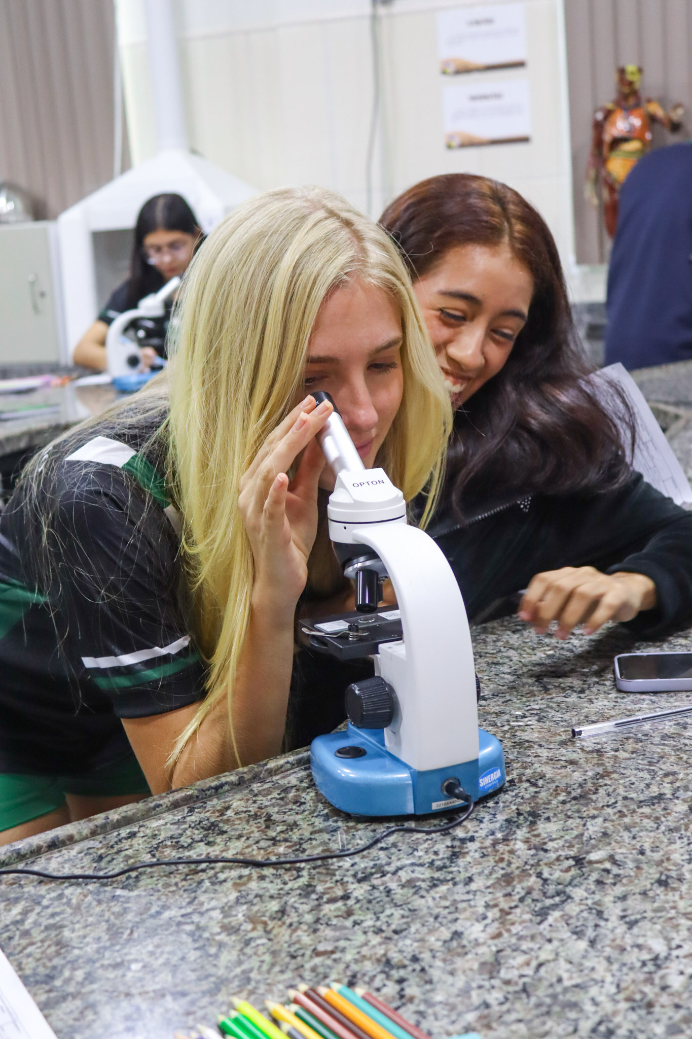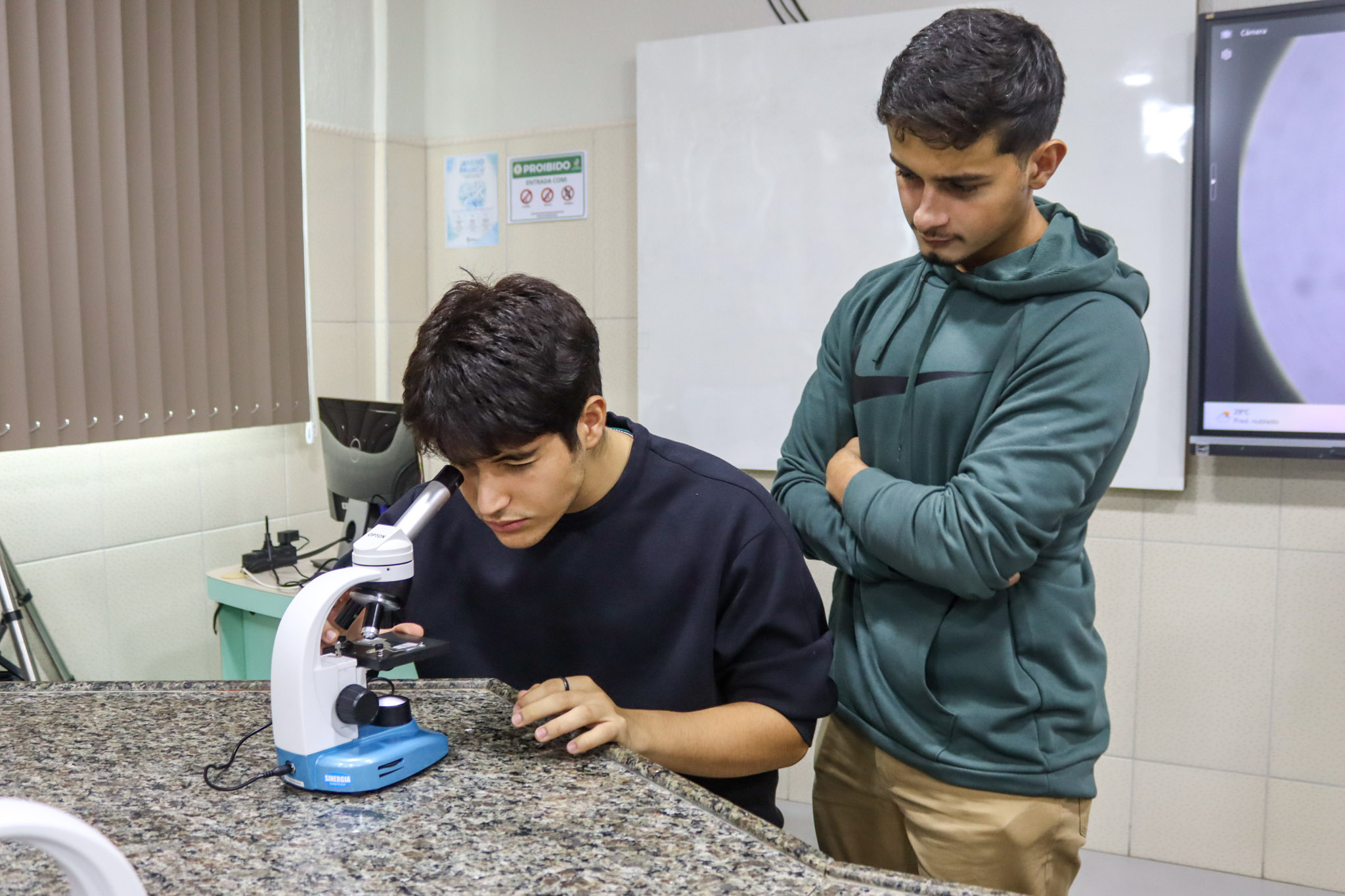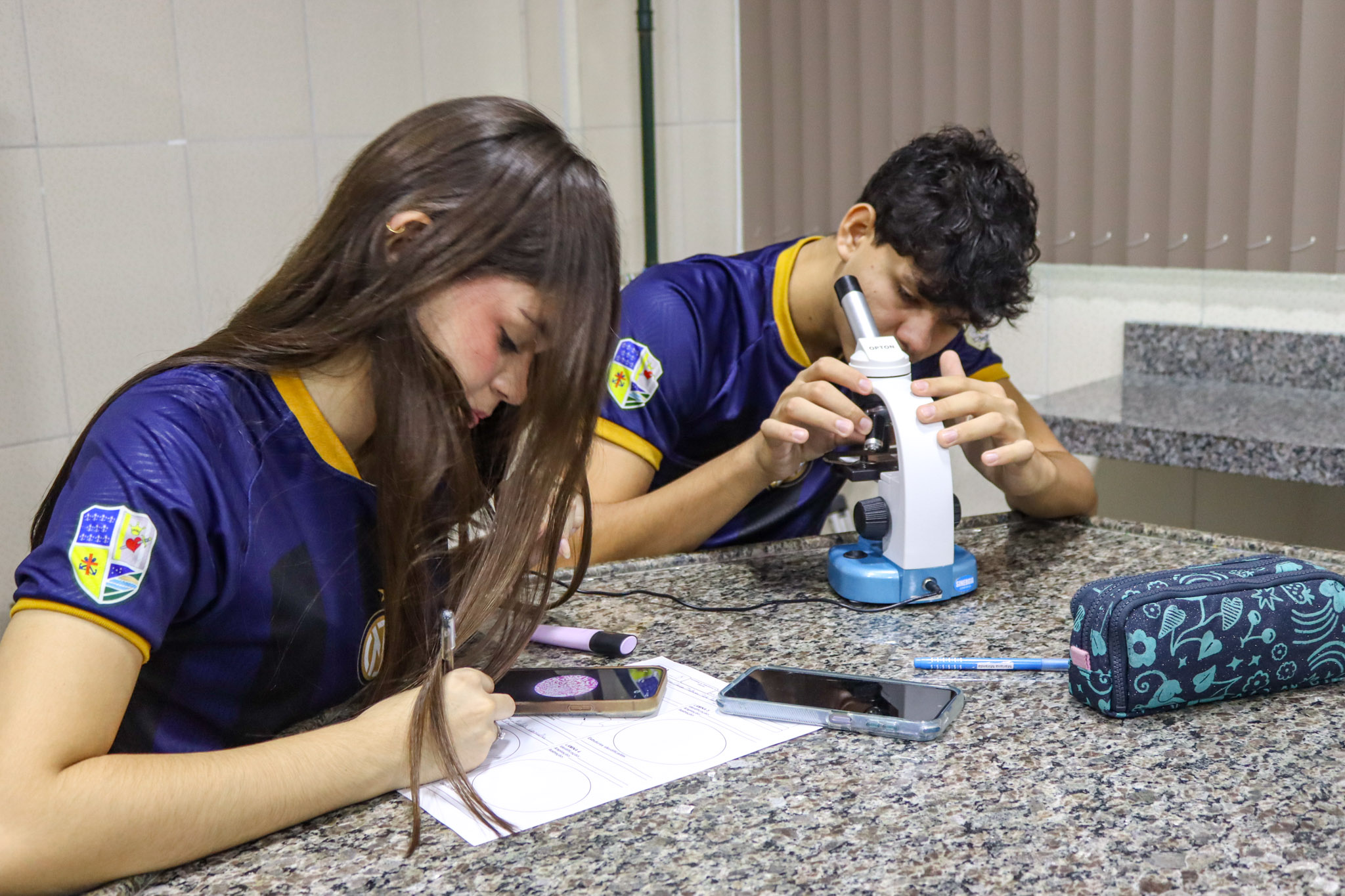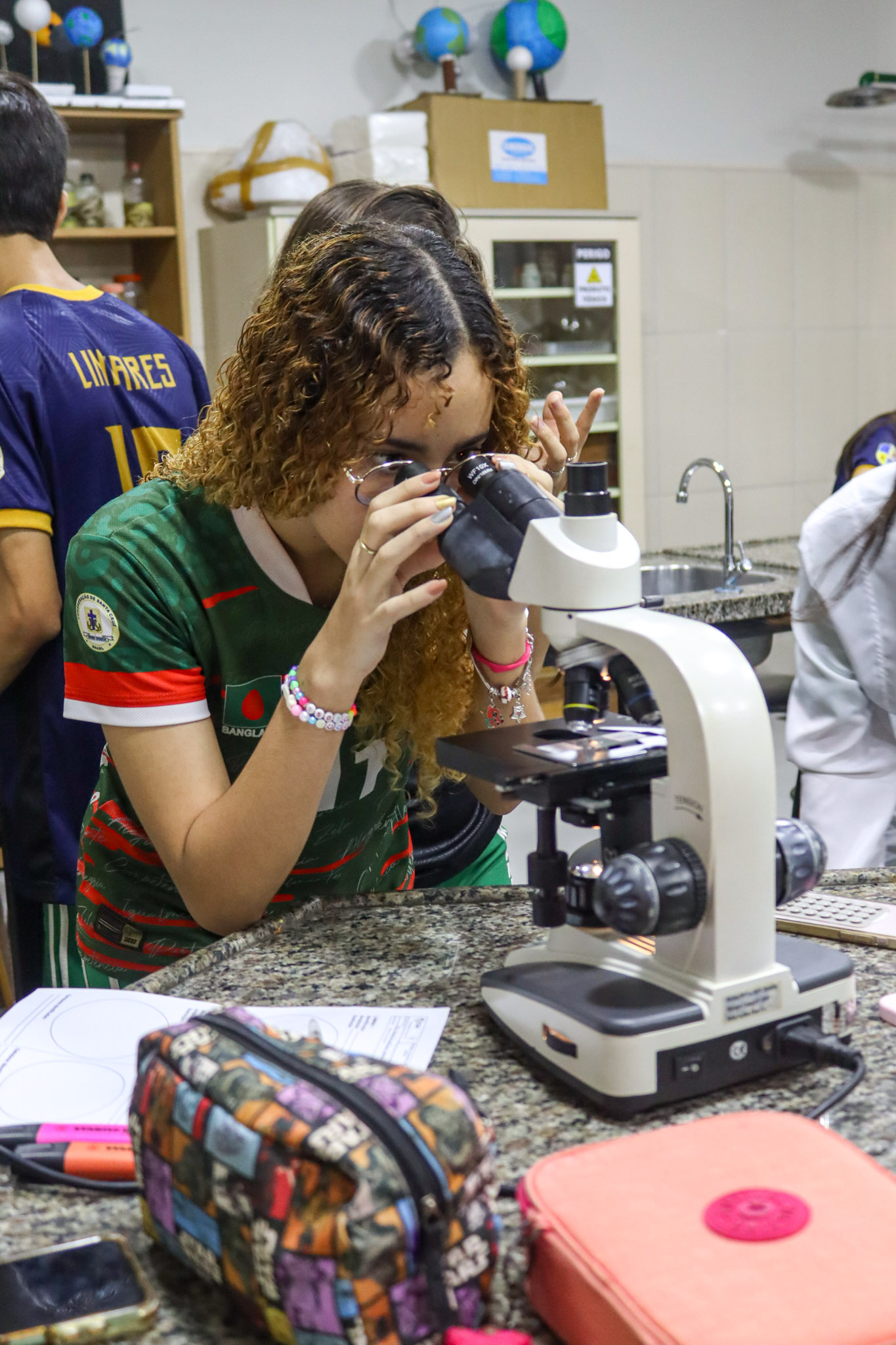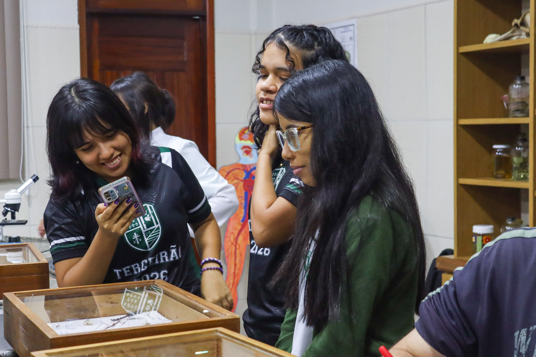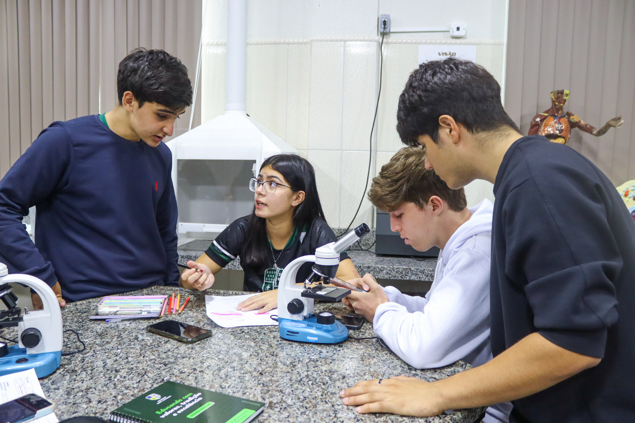 Durante a aula, os alunos aprenderam sobre o funcionamento e a estrutura do microscópio óptico, além de técnicas básicas de preparação e observação de lâminas. Com o auxílio do equipamento, puderam realizar a observação de células e tecidos, identificando estruturas microscópicas e relacionando-as aos conteúdos estudados em sala.