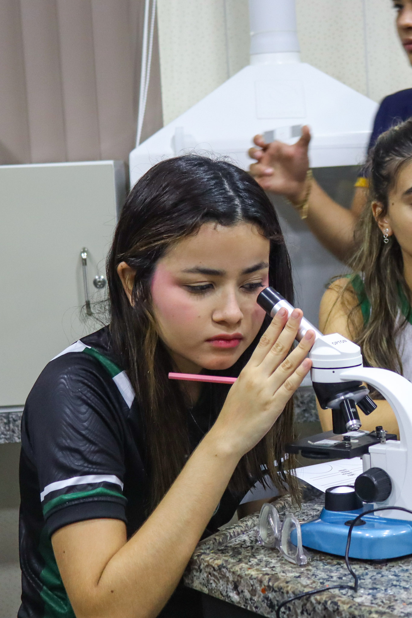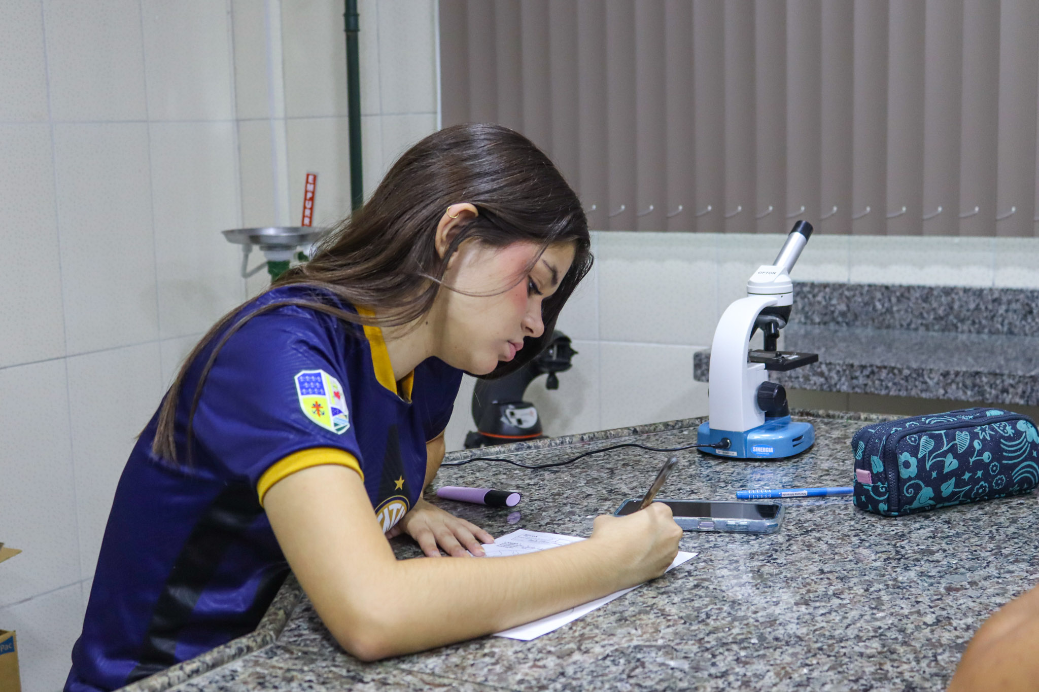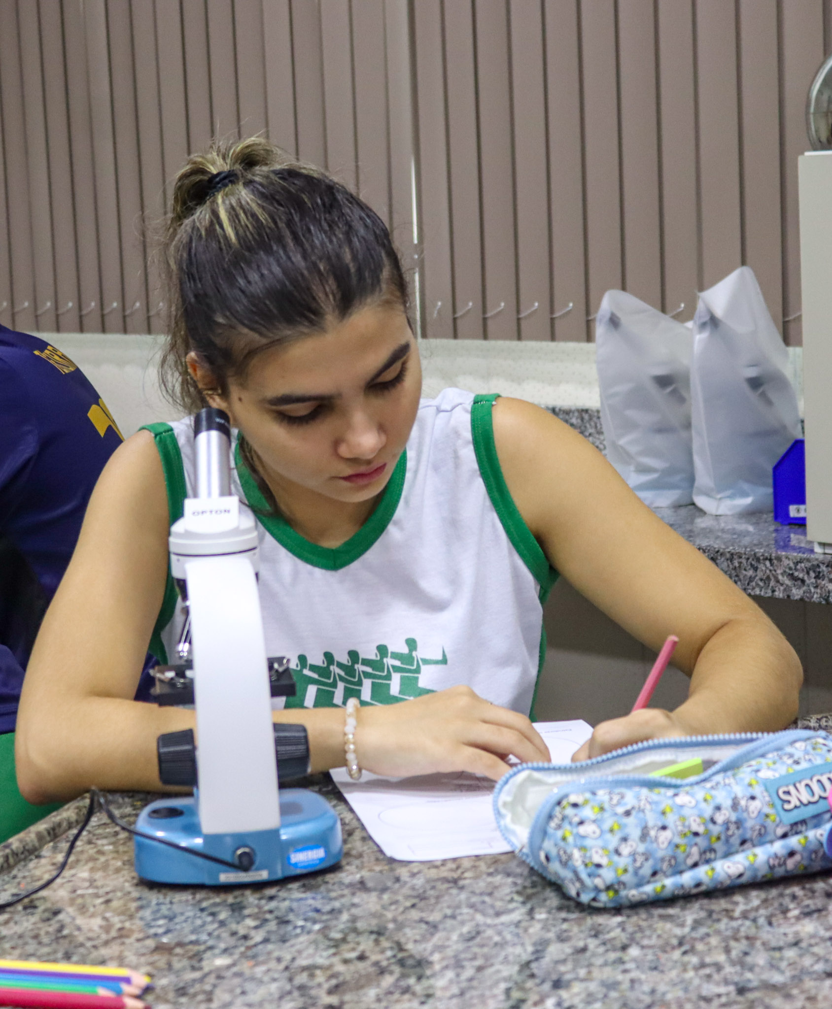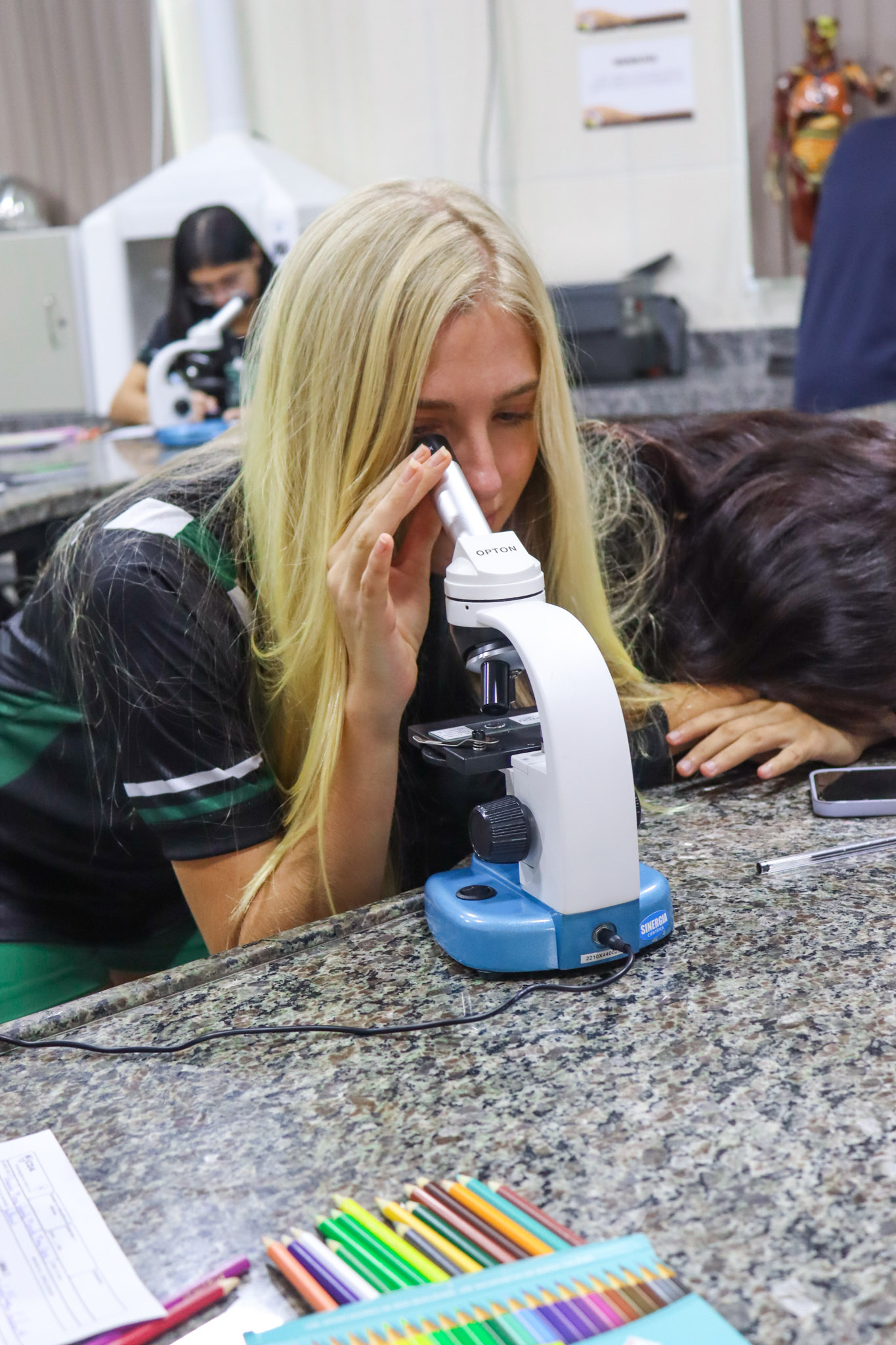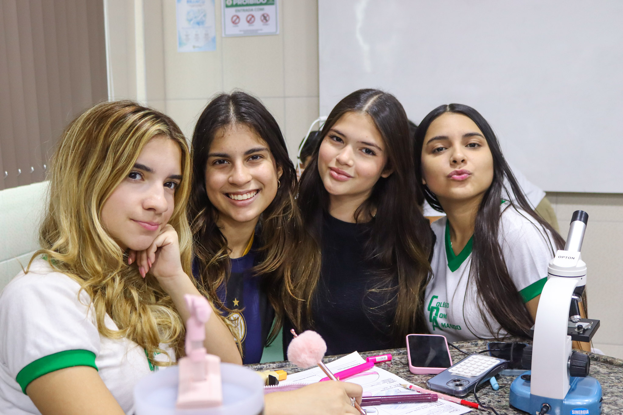 Durante a aula, os alunos aprenderam sobre o funcionamento e a estrutura do microscópio óptico, além de técnicas básicas de preparação e observação de lâminas. Com o auxílio do equipamento, puderam realizar a observação de células e tecidos, identificando estruturas microscópicas e relacionando-as aos conteúdos estudados em sala.